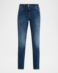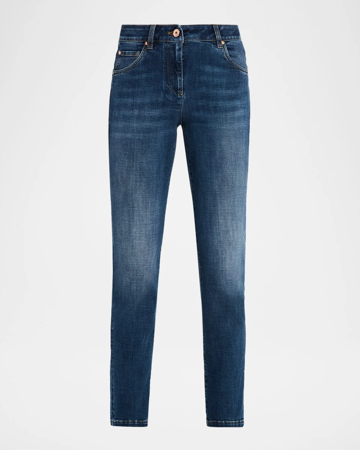 - Brunello Cucinelli darkwash denim jeans with fading and whiskering - High rise - Five-pocket style - Skinny legs - Full length - Button/zip fly; belt loops - Cotton/elastane - Made in Italy