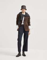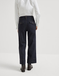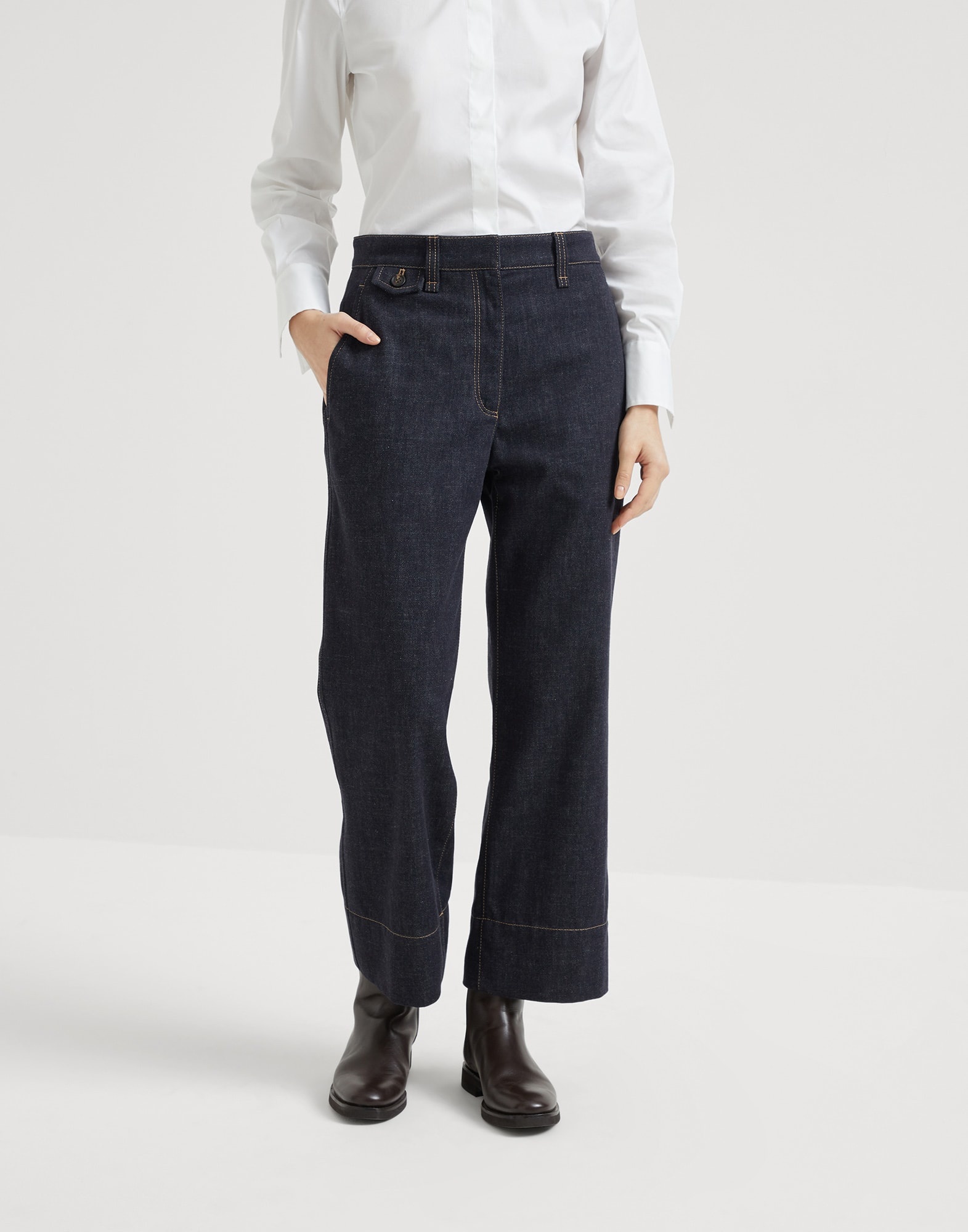 Precious details and timeless fabrics enrich the casual style of these new no-fade denim sartorial square trousers. The style nods to menswear, particularly in the construction of the flap pockets in the back and the flap in the front. The stitching emphasizes the high hem to enhance the cropped length, while the fit that is regular in the hips, becomes slightly boxy and comfortable down the leg. A delicate monili embroidery completes the garment with a sparkling note in true Brunello Cucinelli style. MATERIALS The pure cotton denim is characterized by a lightweight texture and a dark color that does not lighten after washing. DETAILS Zip closure with metal hooks and backing button Slanted front pockets Back welt pocket with flap and button Nickel-free monili decoration 100% COTTON