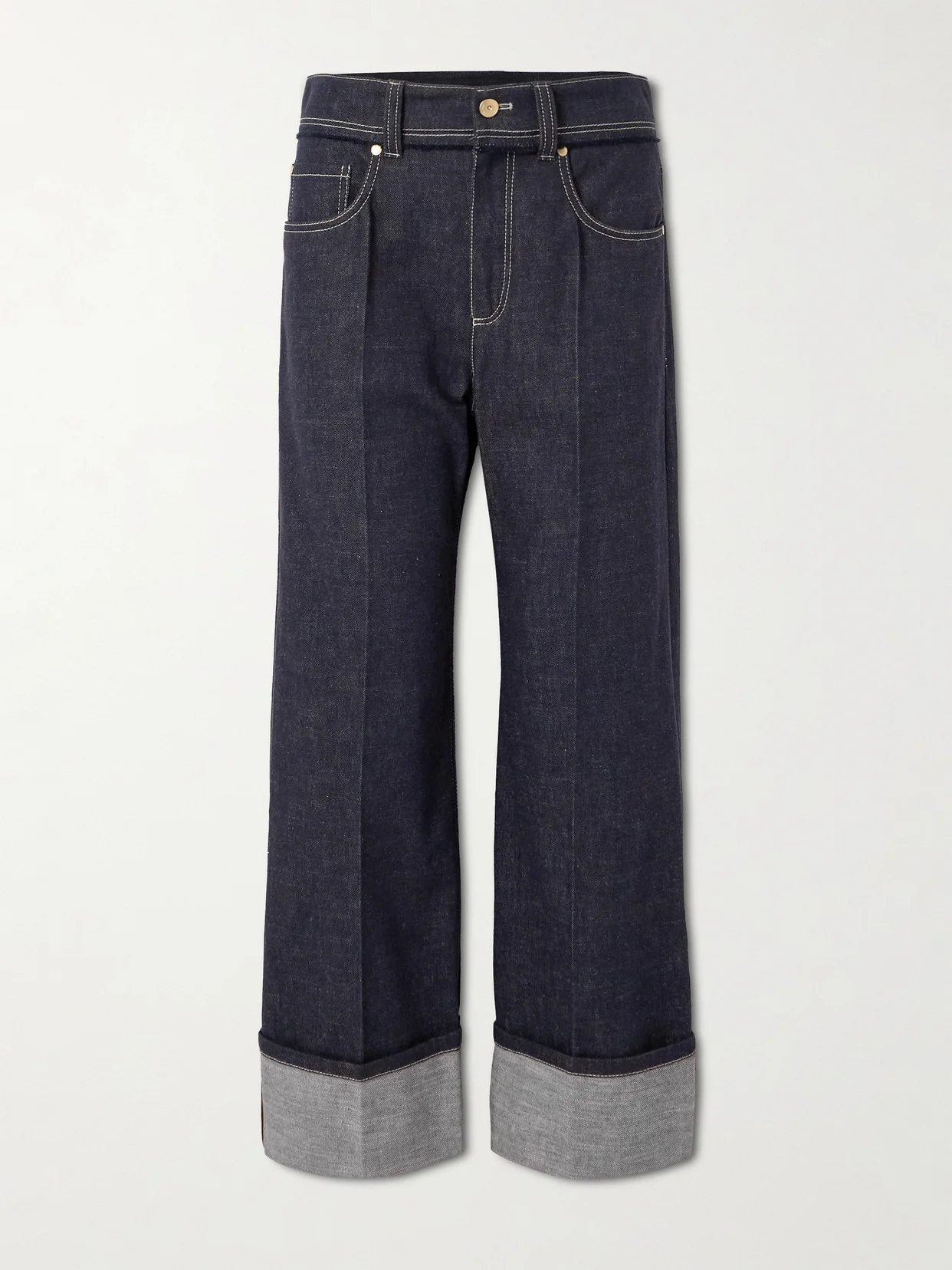 Brunello Cucinelli's jeans are traced with contrasting topstitching, highlighting the high waist and wide legs. They're pressed with sharp creases and look especially cool with the cuffs turned up.