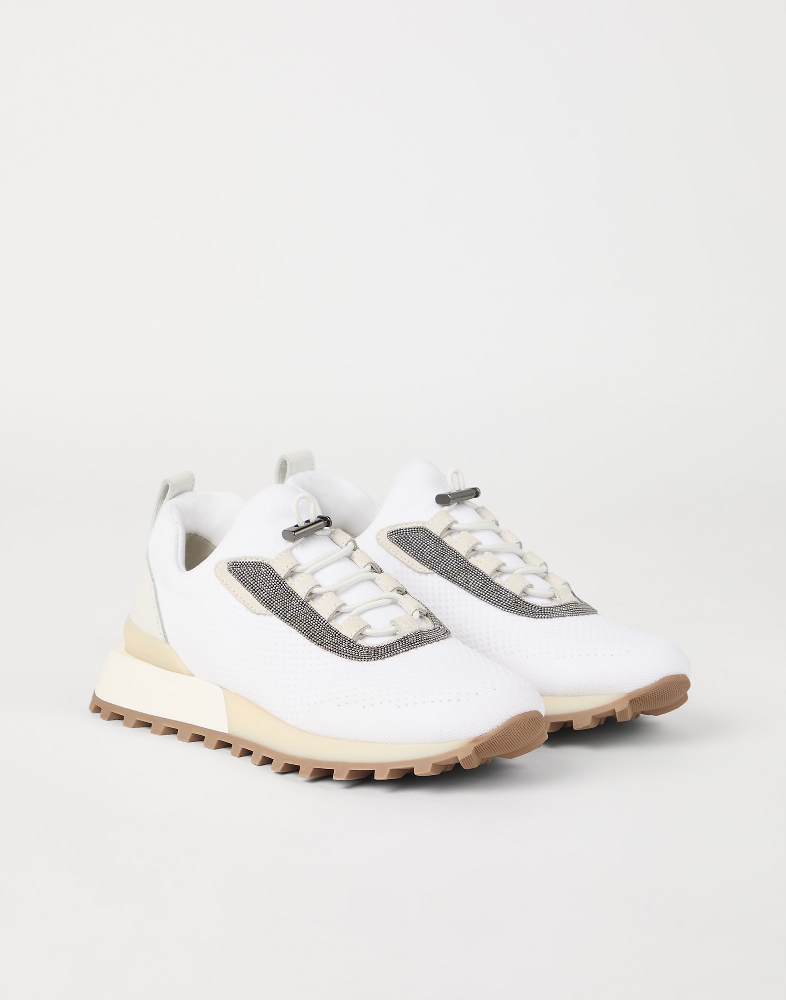 Refined contrasts of texture and shiny embellishments define the look of these new techno fabric and calfskin runners. The style combines the matte, sporty look of techno fabric and calfskin with knitting delivered in a sporty way. A precious monili embroidery enriches the footwear with a touch of feminine sparkle, while the TPU insert on the heel showcases the Brunello Cucinelli logo, completing the design with an elegant detail. The drawstring lacing makes wearing easy. MATERIALS The knitted construction, enriched with calfskin details, offers a flexible and resistant upper. The rubber bottom and TPU rubber tread ensure maximum lightness and perfect the fit’s comfort. DETAILS Drawstring closure Leather and fabric lining Detachable insole Rubber outsole TPU rubber tread Nickel-free monili decoration The rise measures approximately 3.5 cm (1.38") at the highest point 100% NYLON