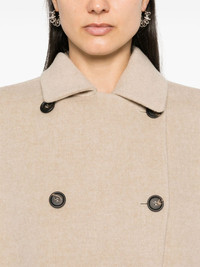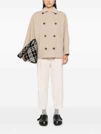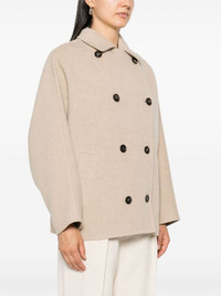 double-breasted jacket Highlights - Medium beige - Virgin wool-cashmere blend - Felted finish - Classic collar - Long sleeves - Two side slit pockets - Unlined - Straight hem - Double-breasted button fastening Made in Italy Composition Outer: Eco Brass 100%, Virgin Wool 90%, Cashmere 10% Lining: Acetate 74%, Silk 26% Washing instructions Dry Clean Only