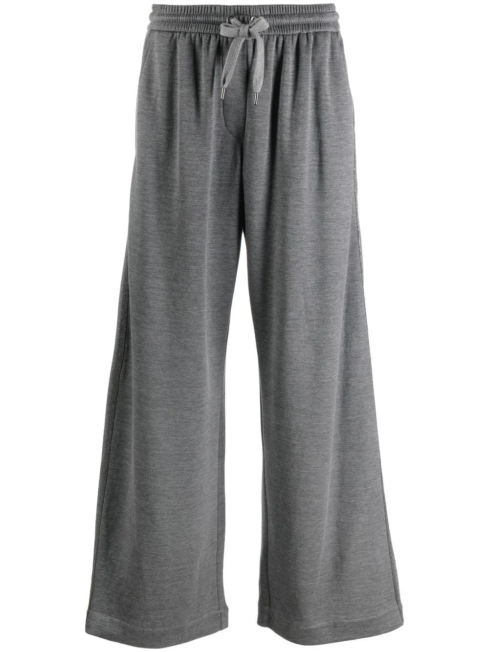 wide-leg track pants Cut for a wide leg, these track pants from Brunello Cucinelli are crafted from a soft blend of cotton and silk in a dark grey hue. The pair is finished with an elasticated drawstring waistband for ensured comfort. Made in Italy Composition Outer: Cotton 67%, Silk 31%, Polyamide 2% Lining: Acetate 74%, Silk 26% SIZE & FIT Model measurements Height 5 ft 10 in(1.77 m) Bust/Chest 32.28 in(82 cm) Hips 35.03 in(89 cm) Waist 25.19 in(64 cm) FittingInformation This piece fits true to size. We recommend you get your regular size Designed to be fitted at the waist and hips, loose over the leg Made with a mid-weight fabric Washing instructions Dry Clean Only