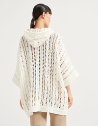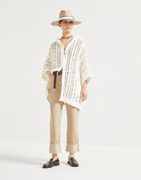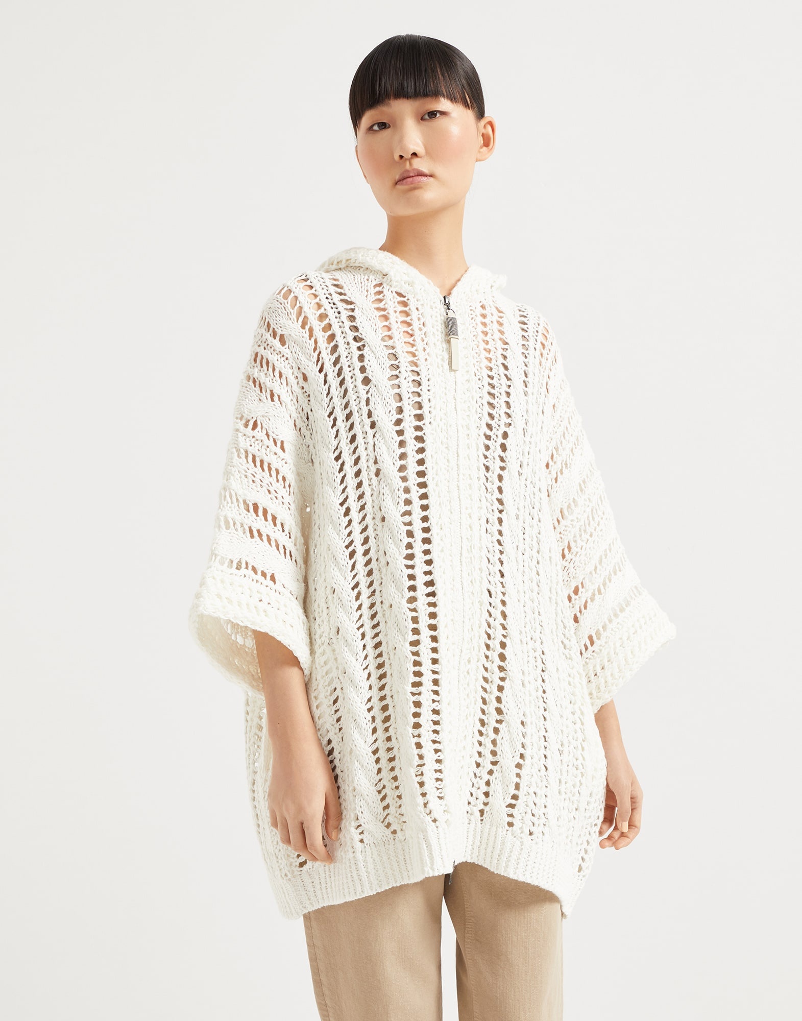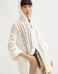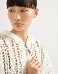Made of natural jute and cotton fibers, this cardigan is defined by its refined Cable & Mesh knitting. The net-like stitch and traditional cable knitting come together to play with solid and empty spaces with a three-dimensional look. The garment features dropped shoulders and generous three-quarter sleeves, creating a relaxed silhouette completed by the sporty hood. A shiny monili embroidered insert enriches the zipper pull with a touch of feminine sparkle in true Brunello Cucinelli style. MATERIALS With a light, soft texture, the yarn is defined by the blend of jute and cotton fibers. A small percentage of a synthetic fiber guarantees the yarn’s durability and structure. DETAILS Two-way zip closure Hood Drop shoulder Wide sleeve Various knit stitches Nickel-free monili decoration 55% JUTE, 35% COTTON, 10% NYLON