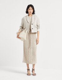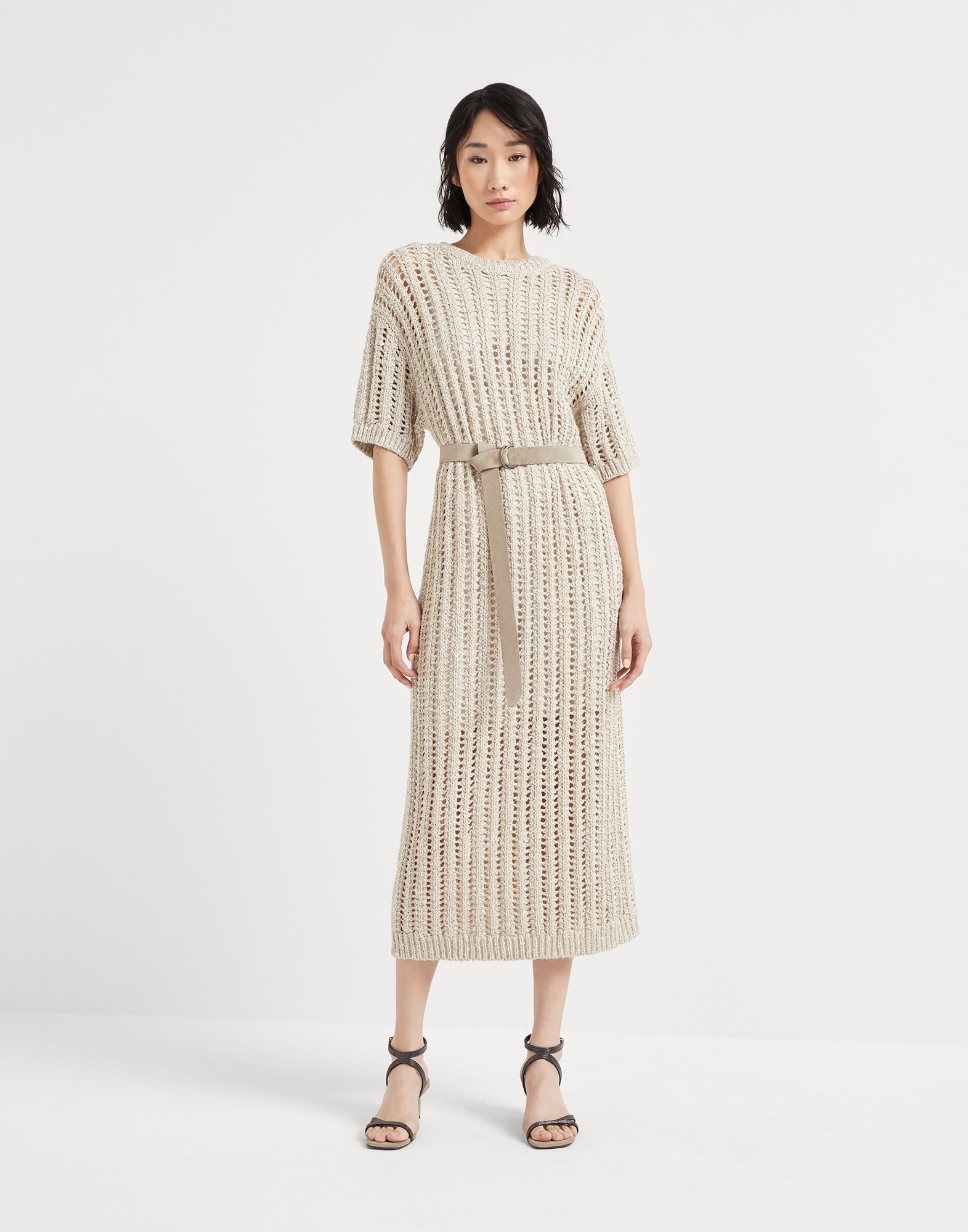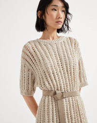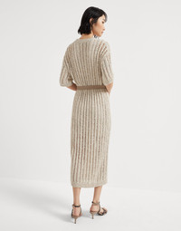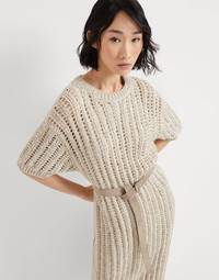 Inspired by the organic, natural world of summer imagery, this Dazzling knit dress is the result of refined materials and precious details. The ribbed openwork creates a very loose striped pattern which plays with solid and empty spaces throughout the garment, illuminating it with the shiny reflections of the sequined yarn. The net-like effect provides a lightweight appearance, while the suede belt delicately highlights the waist and introduces an elegant texture contrast. MATERIALS The yarn stems from a combination of different materials that gives the texture a rustic appearance that is precious at the same time. Slightly irregular, the linen and silk yarn showcases a light, natural color, a contrast with the cotton yarn and the Diamond yarn equipped with tonal sparkling paillettes. DETAILS Crew-neck Drop shoulder Detachable ring belt Half-lined in silk-blend crepe Various knit stitches Removable slip 36% SILK, 34% LINEN, 17% NYLON, 13% POLYESTER