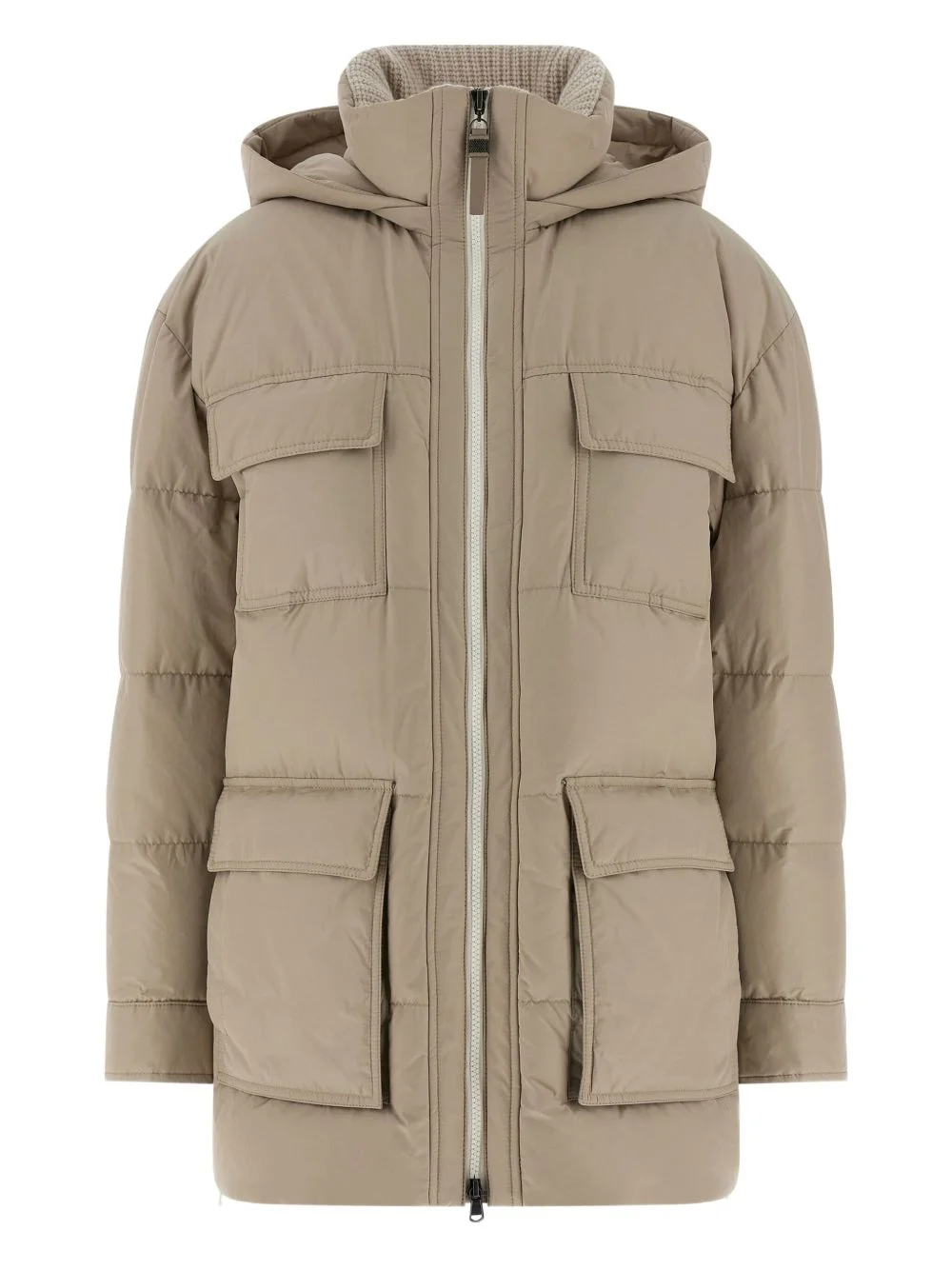 quilted padded coat Highlights - Beige - Removable hood - Crochet knit insert - Front zip fastening - Patch pockets Made in Italy Composition Outer: Polyester 55%, Cotton 45% Lining: Down 100% Washing instructions Read Manufacturer Guidelines