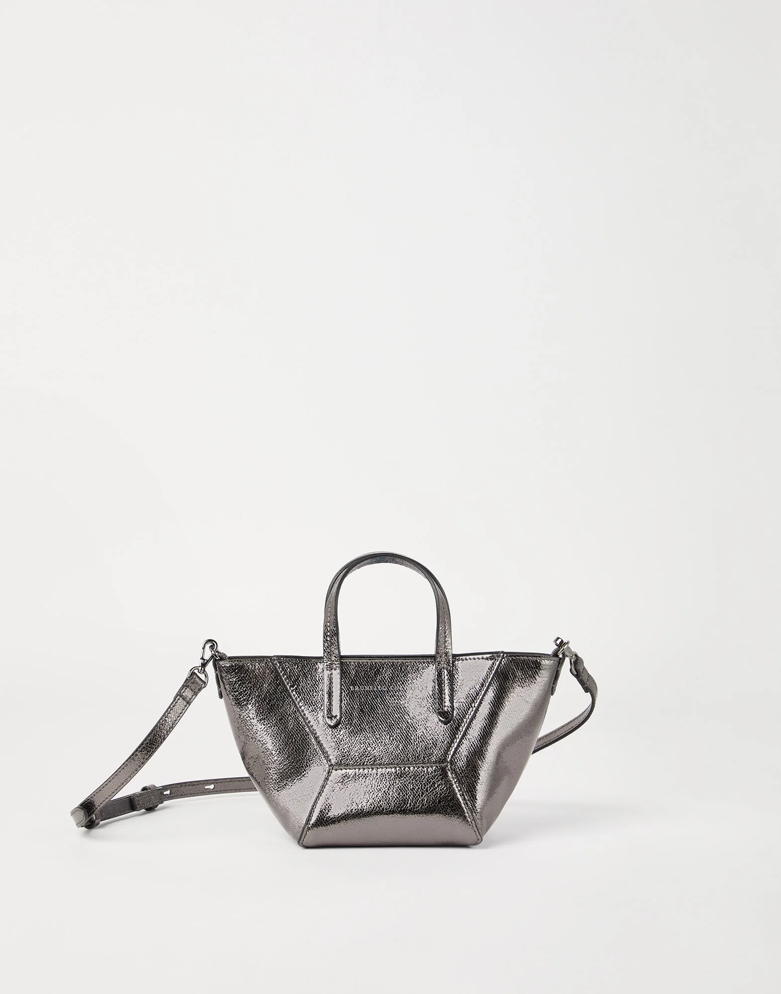 This BC Duo mini bag in lame calfskin reinterprets the iconic design of the Brunello Cucinelli “everyday bag” with a contemporary touch. The construction of the accessory is designed to enhance the lightness and essentiality of the shape. Thanks to refined finishes and subtle stitching, geometric panels sculpted with straight and diagonal lines converge into a harmonious, balanced whole. Offered in a smaller size for sophisticated, casual elegance, the bag offers versatility thanks to the internal ties on the side, allowing you to modify its shape making it even more compact. The magnetic closure and the removable shoulder strap add practicality, while the monili embroideries enrich the design with a sparkling feminine note. MATERIALS The refined calfskin is enriched with a special finish that gives the texture a rich grain and a very shiny metallic effect. DETAILS Magnetic snap closure Adjustable and detachable shoulder strap Double handle Suede lining 2 slots for cards and business cards Nickel-free monili decoration Bag is 25 cm (9.84") long, 10 cm (3.94") wide, and 14 cm (5.51") high 100% REAL LEATHER