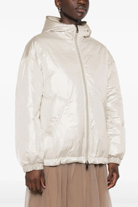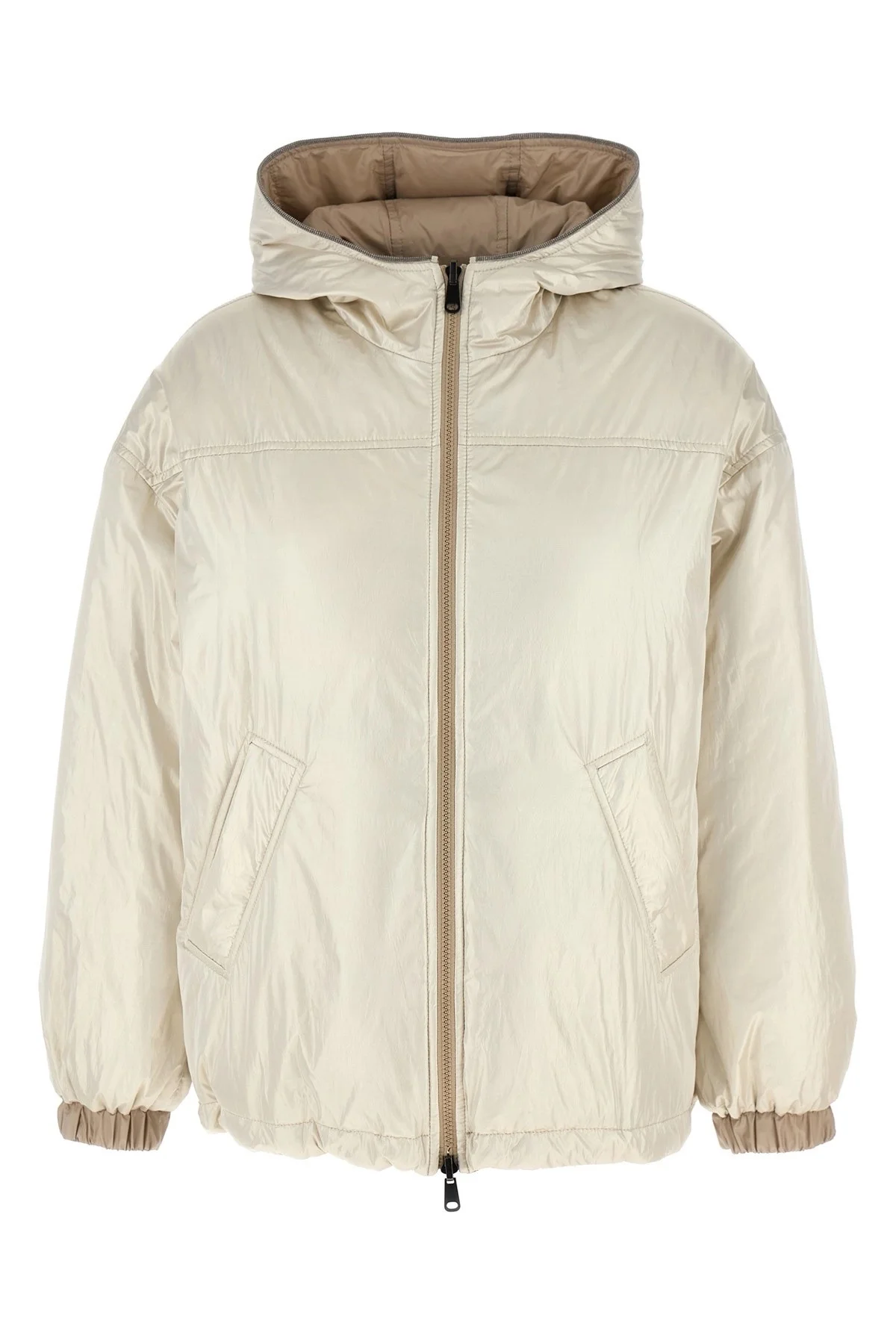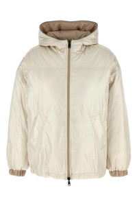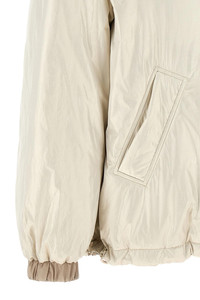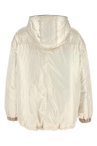 cod. ML1597861PC130 Reversible nylon down jacket with goose feather padding, one side with laminated effect, zip closure, pockets, long sleeves with elastic cuffs, hood with Monile detail. Color: Beige Size & Fit: true to size fit Composition: 75% polyester, 25% metal