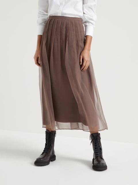 Refined materials are paired with distinctly feminine style to create this new Paneled Circle skirt. Ultra-lightweight Crispy silk panels of different lengths are layered to enrich the garment with a sense of movement and volume. The refined fabric’s ethereal, impalpable appearance emphasizes the slightly flared silhouette at the bottom, while the silk-blend crepe lining perfects the comfort. MATERIALS Refined Crispy silk is an ultra fine fabric characterized by a transparent, matte look. The fabric’s delicate color stems from a particular dye that preserves the fiber’s natural textured effect. DETAILS Back zip closure Silk-blend crepe lining 100% SILK