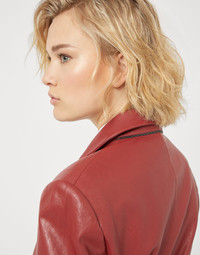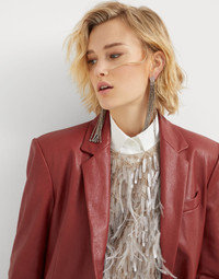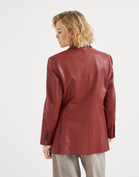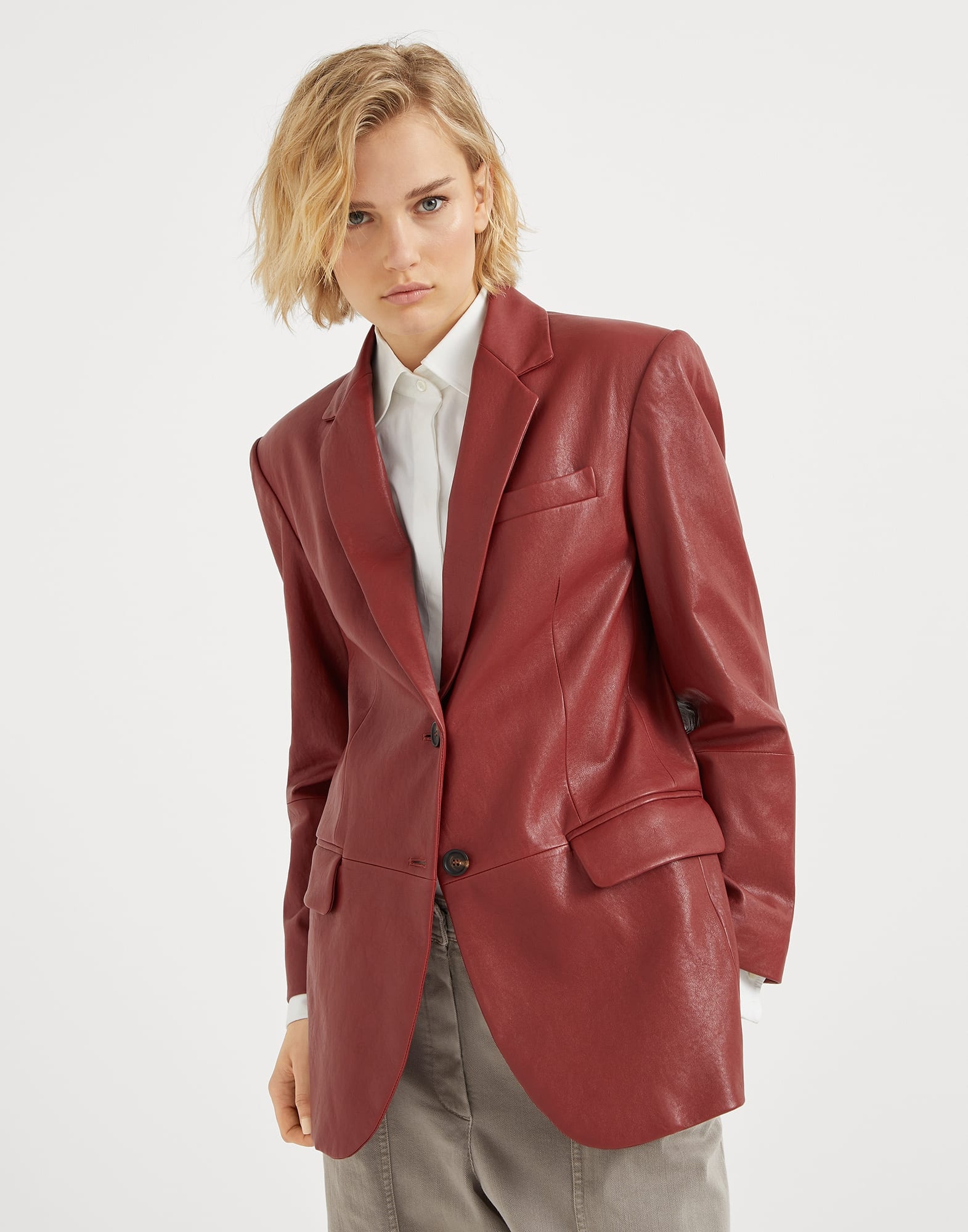 Natural leather adds a bold allure to this sartorial-inspired blazer. The refined leather’s semi-polished appearance enriches the essential lines of the garment, characterized by the classic lapels and flap pockets. The fit features regular proportions and a slightly tapered silhouette at the waist. The shiny monili detail adds a delicate sparkling touch. MATERIALS The finish of the refined leather is characterized by a soft texture and a fine grain that enhances the beauty of the material, giving it a natural appearance. DETAILS Horn button closure Lined Notched lapel Chest pocket Hand pockets with flap Cuffs have four horn buttons Double back vent Nickel-free monili decoration REAL LEATHER
