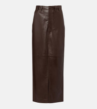 Crafted in Italy from supple leather, this Brunello Cucinelli maxi skirt reflects the maison's signature refined elegance. Timeless and sophisticated, this design features slant and back pockets, zip-hook and button closure, and a long vent. Product Details - Material: 100% leather - Care instructions: specialist clean - Made in Italy - Designer color name: Dark Brown - Item color: brown - Details: 100% brass - Lining: 65% acetate, 35% polyester - Contains non-textile parts of animal origin - Closure: zip, hook, and button fastening - Double belt loops - Pockets: slant pockets, back pockets - Long vent - Includes: dust bag - Item number: P01083455 Size & Fit - True to size - Non-stretchy fabric - slit length 60,0cm-23.5" - The model seen in the picture is 178cm-5'10" and wearing a size IT 40