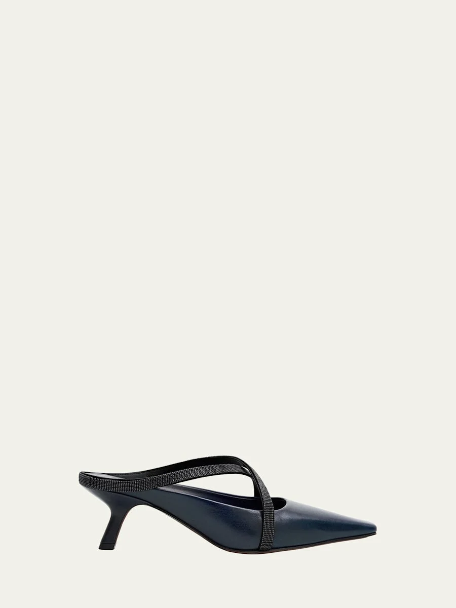 Brunello Cucinelli smooth calf leather mule pumps with signature monili beading detail 2.25 in / 55 mm kitten heel Snipped, pointed toe Crisscross vamp Slide style Polyurethane outsole Lining: Leather Professional cleaning recommended, spot clean Made in Italy Online Inquiries: BGS21_X6RVC| Store Inquiries: #4918502