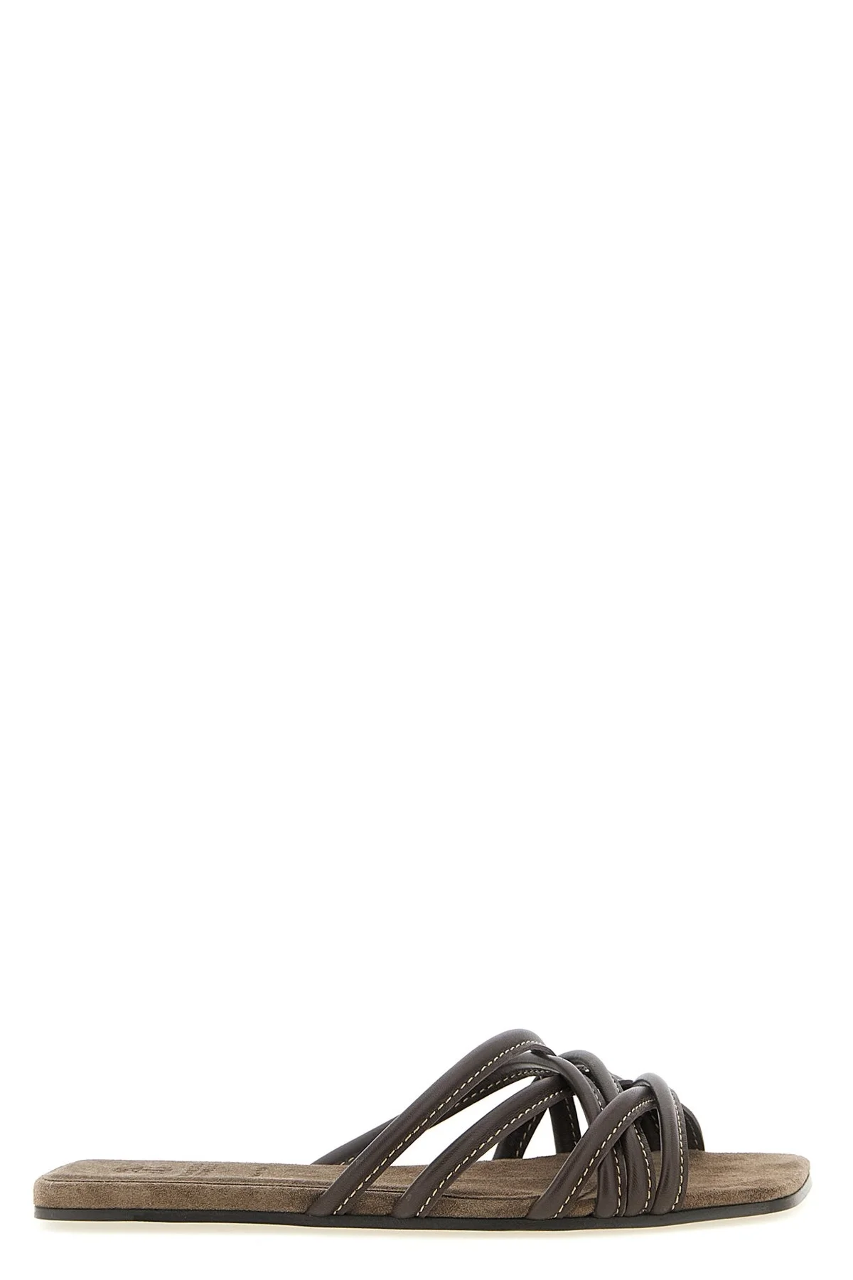 cod. MZGAC3239C8279 Leather slides, contrast stitching, suede insole, leather and rubber sole. Color: Brown Size & Fit: §EU WOMEN Composition: 100% lamb leather (Ovis aries) Made in: Italy