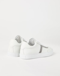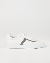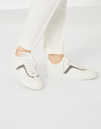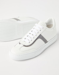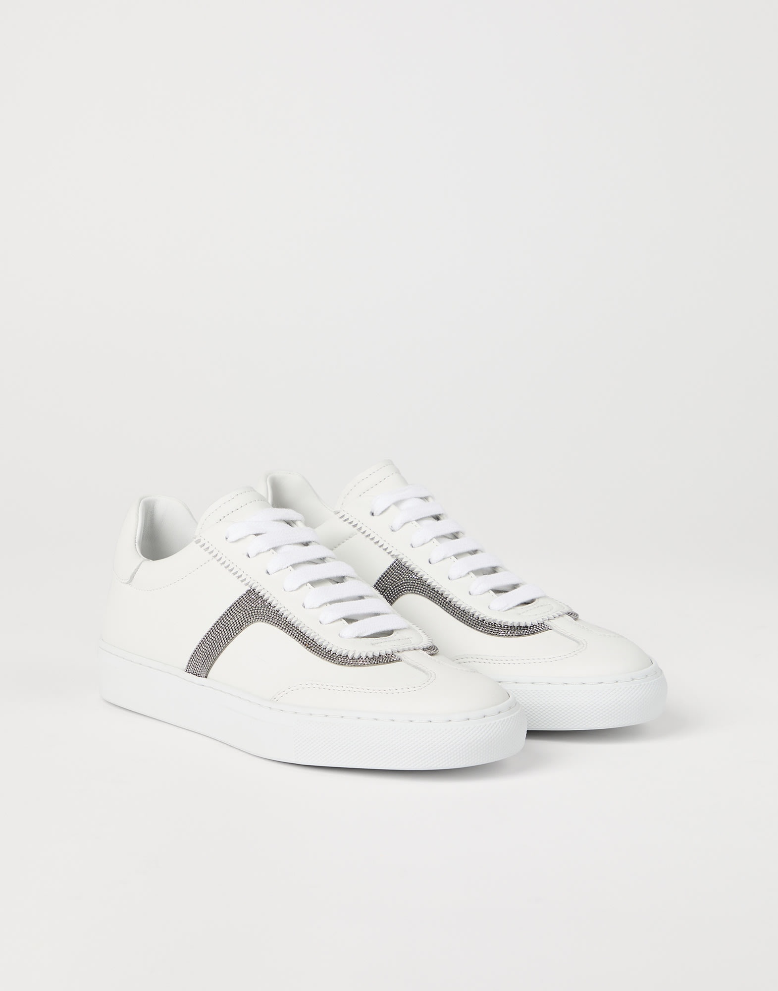 The sporty, essential allure of these sneakers is enriched with the iconic embellishment of the Brunello Cucinelli collections. An insert embroidered entirely with fine rows of shiny monili stands out on the sides, creating an elegant sparkling effect that enhances the refined leather’s smooth texture. MATERIALS Matte calfskin delivers a smooth, soft and even texture. The leather’s matte appearance brings out the colors of the season with a rich and intense effect. DETAILS Flat fabric laces Leather lining Detachable insole TPU rubber sole TPU rubber tread Nickel-free monili decoration 100% REAL LEATHER