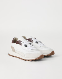 The new runners enrich Brunello Cucinelli’s iconic Active footwear line. The upper combines fine grained calfskin with soft and velvety suede to create a sophisticated textural contrast. Small cylindrical details, entirely embroidered with rows of shiny monili, embellish the shoelaces with a subtle, feminine sparkling note. MATERIALS Calfskin, with a compact, slightly shiny texture, and suede, with a velvety and sophisticated look, enrich the upper of this design, complemented by the removable insole and by the lightweight micro sole. DETAILS Flat cotton laces Fabric lining Detachable insole Sole in lightweight micro rubber The rise measures approximately 2 cm at the highest point Nickel-free monili decoration REAL LEATHER