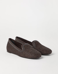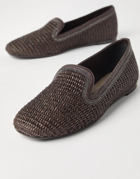 The summery allure of techno raffia updates the essential silhouette of these new slippers. The woven texture gives the style a light, natural feel, while the refined suede lining creates an elegant material contrast. The feminine touch of the embroidered shiny monili inserts illuminates the sides of the footwear with the iconic embellishment of the Brunello Cucinelli collections. MATERIALS The material is characterized by a slightly “rustic” woven texture inspired by the typical look of raffia. The leather sole with rubber heel and the non-slip rubber inserts on the bottom define the comfortable fit. DETAILS Suede lining Leather outsole with rubber heel and non-slip island at the toe Nickel-free monili decoration 52% COTTON, 48% NYLON