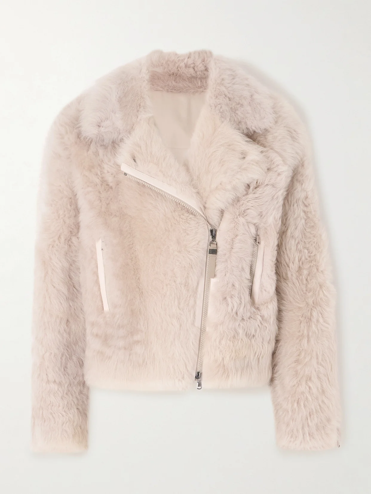 Brunello Cucinelli's jacket is modeled on classic biker styles. Made from fluffy shearling, it has smooth leather trims and an asymmetric front.