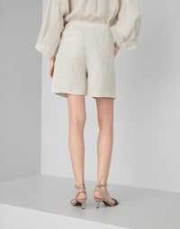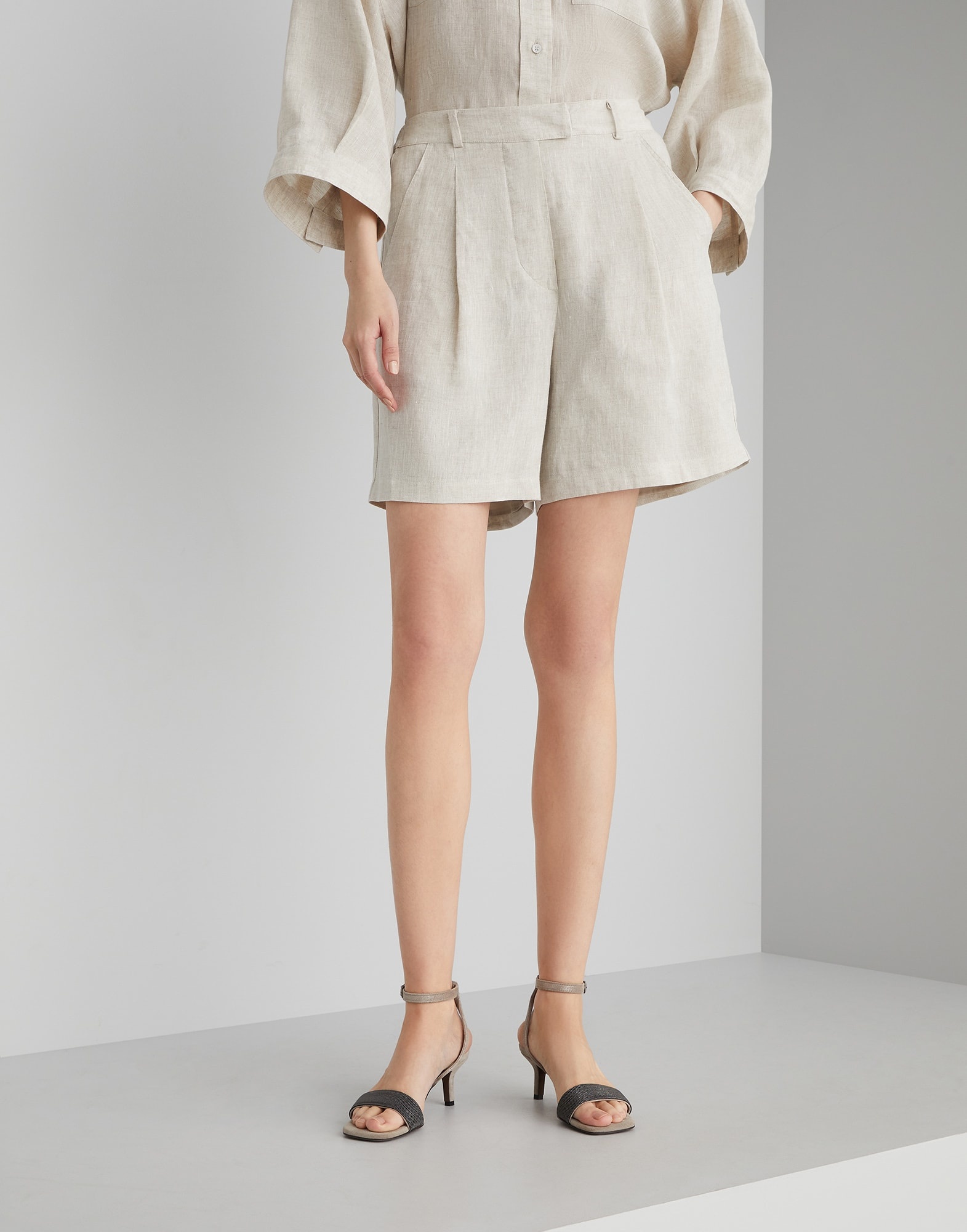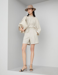 A distinctly summery feel characterizes these lessivé linen shorts. The crisp textured fabric enhances the casual style of the Baggy silhouette, enriched with tailored details like pleats and a hook closure. The shorts can be matched with the shirt made in the same fabric to create a Coordinated Set that is perfect for the summer. MATERIALS The ultimate summer fiber enriches the collection of Brunello Cucinelli fabrics. A slightly irregular and dry texture of the linen fiber gives the garment a natural, light look. DETAILS Zip closure with button, metal hook and backing button Front pockets Back welt pockets Pleat 100% LINEN