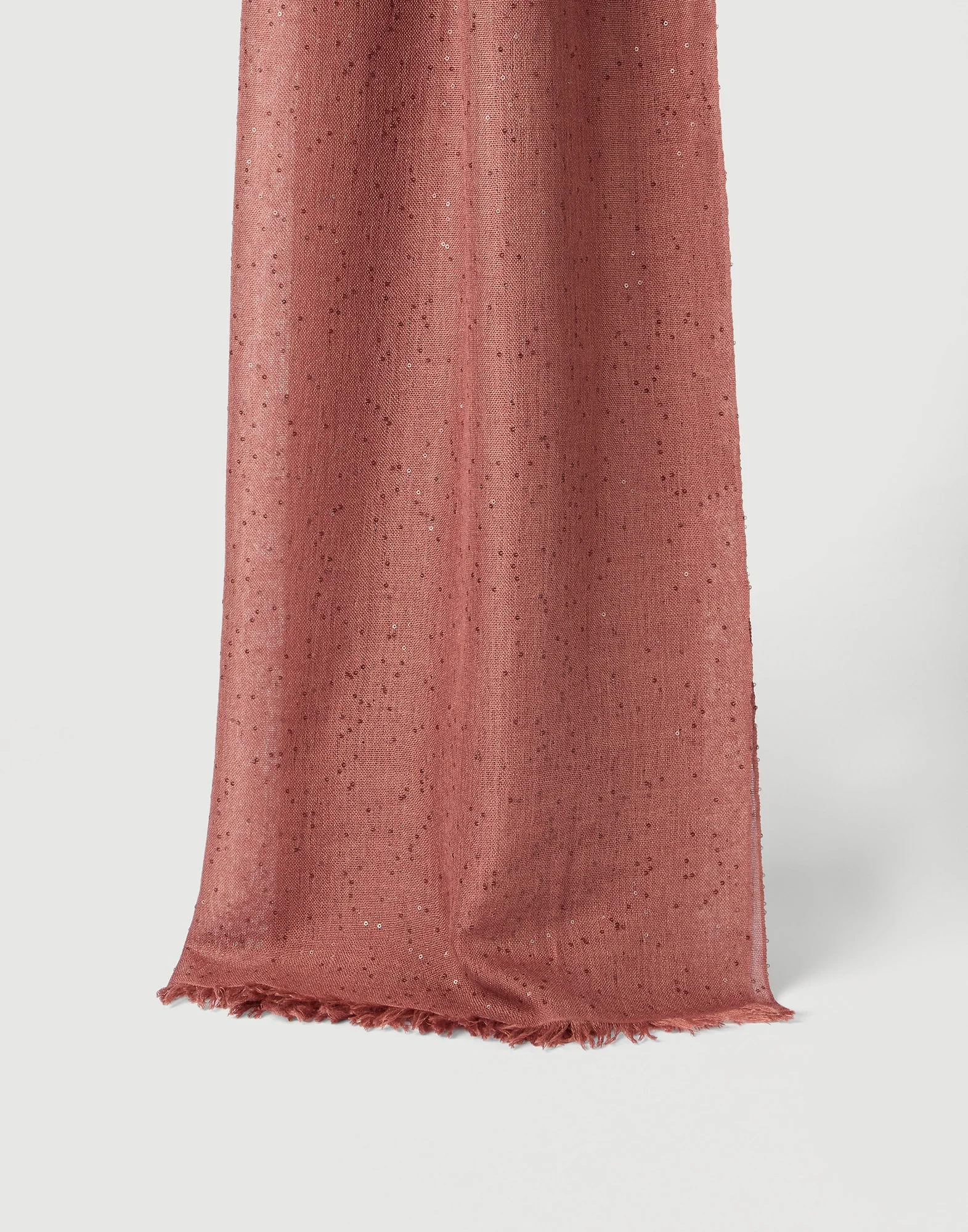 A precious yarn enriches the essential style of this lightweight cashmere and diamond silk scarf. The yarn’s soft texture showcases small paillettes that spread delicate sparkling reflections throughout the entire surface. MATERIALS A precious material of Brunello Cucinelli collections, Diamond yarn combines the soft, enveloping effect of noble cashmere and silk fibers with the sparkling reflections spread by the small paillettes incorporated into the yarn. DETAILS Short side with fringe The scarf measures approximately 100 cm (39.37") x 220 cm (86.61") 70% CASHMERE, 30% SILK