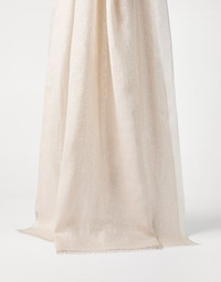 The quality of Brunello Cucinelli materials lends an elegant touch to the scarf. Sparkling reflections spread by the lame thread blend with the noble natural fibers’ soft and enveloping effect. MATERIALS The refined fabric combines the qualities of the cashmere and silk fibers with an extra fine lame yarn to spread sparkling reflections along the surface of the accessory. DETAILS Short side with fringe Scarf measures approx. 90 cm (35,43") x 120 cm (47,24") 55% CASHMERE, 33% SILK, 12% NYLON