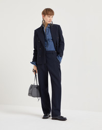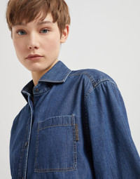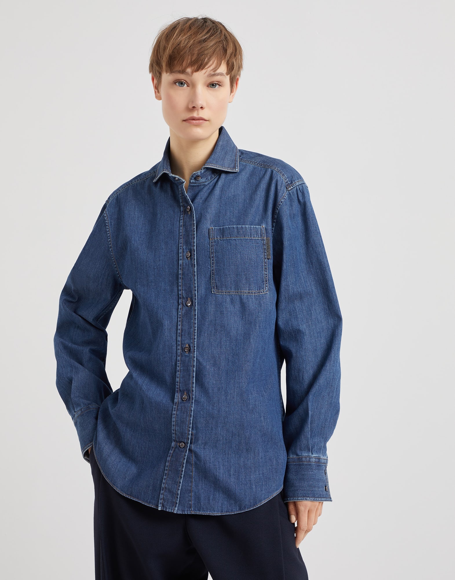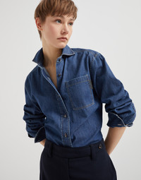 The unmistakable character of lightweight denim is paired with feminine lines and details in this shirt. The classic patch pocket on the chest is enriched with the distinct embellishment of the Brunello Cucinelli collections: a shiny monili label stands out on the outside edge, giving the garment a precious touch. The slightly tapered lines to the body and the volume of the sleeves complete the shirt’s comfortable fit. MATERIALS Lightweight pure cotton denim uses combed threads that give the texture a light, compact and semi-glossy appearance. The dye on the fabric spreads the color with slight color shading which can evolve with regular use and washing, a luxurious trait that makes each style unique. DETAILS Placket closure with mother of pearl buttons Classic collar Chest pocket Cuffs have two mother of pearl buttons Nickel-free monili decoration 100% COTTON