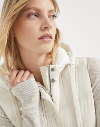 Lightness, protection and refined details define the style of this lightweight matte nylon down vest. Ideal for the transitional months between seasons, the comfort of this garment is guaranteed by its practical drawstring hood and large side pockets, while a precious shiny monili embroidery runs along the zipper closure and adds a refined, feminine touch to this piece. MATERIALS The matte quilted nylon, a smooth, fine fabric which has a finish to protect the garment from the slightest contact with water, is combined with soft, high-quality goose down and feather fill. All of the padding used comes exclusively from European suppliers who are members of the EDFA (European Down and Feather Association), guaranteeing animal and environmental welfare. DETAILS Double closure with zip and snaps Water-resistant nylon lining Adjustable drawstring hood Hand pockets with snap Drawstring hem Thermore® padding Nickel-free monili decoration 100% NYLON