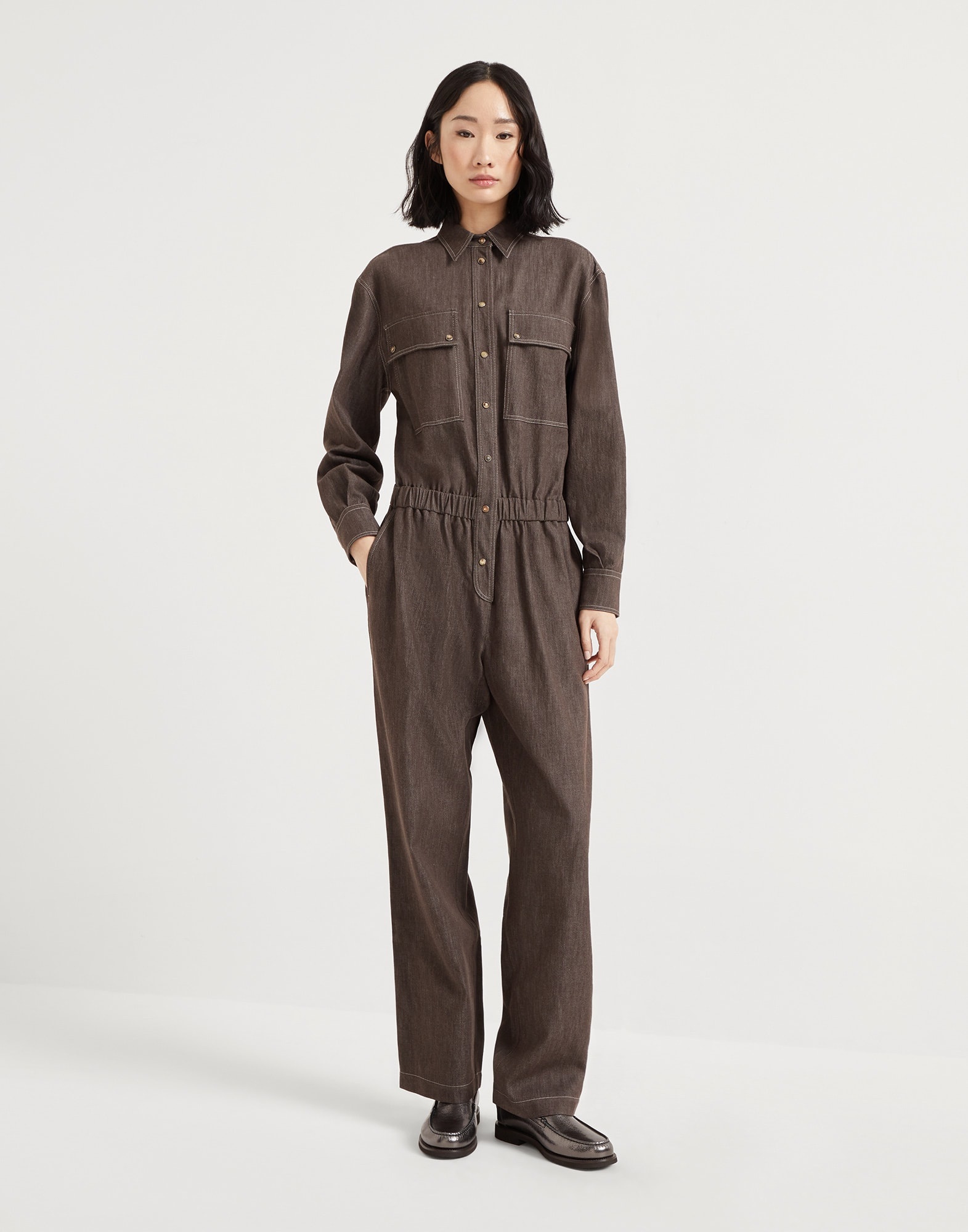 A distinctly feminine, informal attitude defines this new no-fade denim jumpsuit. Inspired by menswear, the garment showcases contrasting stitching that emphasizes the chest pockets with a utility wear feel. The fit offers regular proportions through the chest and comfortable volume down the leg, while tightening in the waist. The delicate monili embroidery illuminates the rear belt loop with a refined sparkling note in true Brunello Cucinelli style. MATERIALS The new pure cotton no-fade denim has an extraordinarily light texture and a dark color that does not lighten after washing. DETAILS Horn snap closure Classic collar Upper patch pockets with flap and buttons Snap at cuffs Elastic waistband Slanted front pockets Back patch pockets Cuffed hem Nickel-free monili decoration 100% COTTON