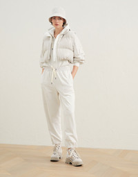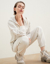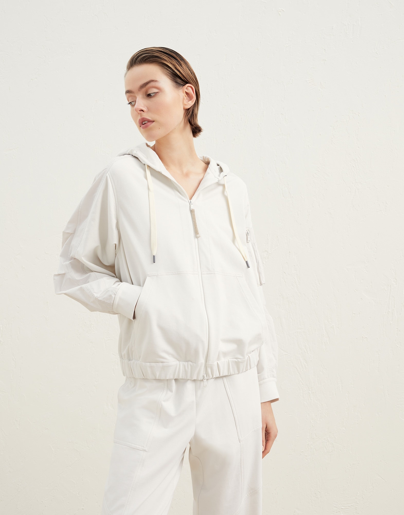 Refined Brunello Cucinelli materials are paired with the casual style of the Travelwear line, dedicated to moments of relaxation and free time. The relaxed, comfortable lines of this Utility sweatshirt in lightweight stretch cotton French terry is combined with the functional design detail of the cargo pocket, which stands out on the slightly oversized proportions of the sleeve. A precious monili embroidery illuminates the zipper pull and completes the garment with a feminine note in true Brunello Cucinelli style. MATERIALS The stretch characteristic of the lightweight cotton French terry makes the garment comfortable to wear. DETAILS Designed in Solomeo and handcrafted in Italy 98% COTTON, 2% ELASTANE
