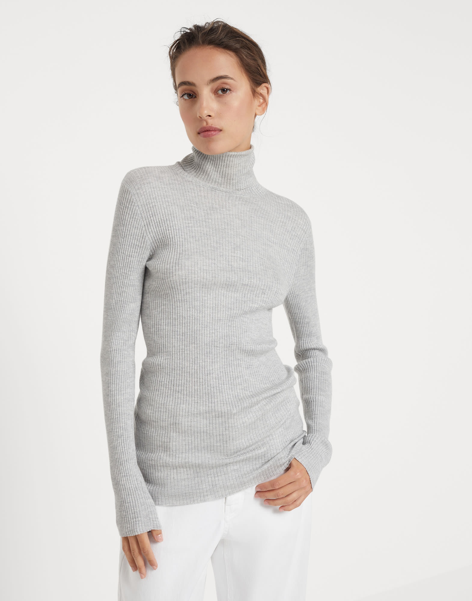 The excellence of Brunello Cucinelli materials enriches the classic flavor of this cashmere and silk Sparkling yarn rib knit turtleneck sweater. The lightweight, soft yarn combines the refined qualities of the natural fibers with a lame thread which spreads delicate metallic reflections along the surface. Both regular and comfortable proportions are offered by the fit. MATERIALS Cashmere and silk fibers are manufactured together with a fine lame thread to enrich the texture with delicate metallic reflections. The presence of a synthetic fiber provides added comfort. DETAILS High collar Regular shoulder Regular sleeve Rib knit 51% CASHMERE, 22% SILK, 20% NYLON, 7% POLYESTER