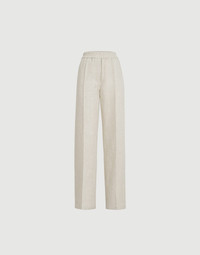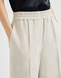 Refined fabrics elevate the relaxed silhouette of these loose track trousers in linen and cotton chevron. Iconic motifs of masculine elegance are reimagined in a feminine way to create a garment with a casual, summery feel. The soft, straight lines down the leg are completed by the practical pull-on fit. MATERIALS The linen and cotton chevron combines yarns of different thicknesses to create a herringbone pattern with a textured, slightly three-dimensional appearance. DETAILS Pull-up trousers Slanted front pockets Back patch pockets Plain hem 88% LINEN, 12% COTTON