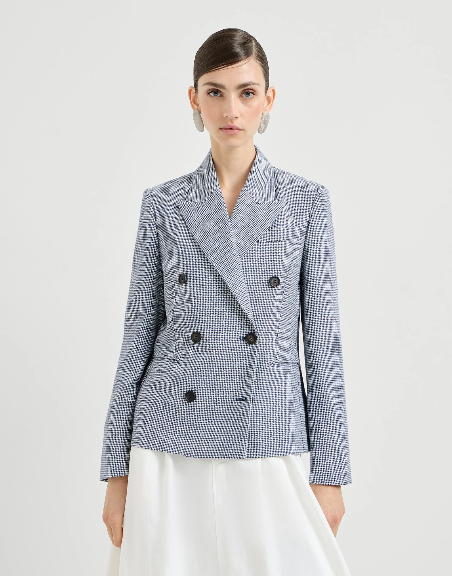 The tailored feel of linen and cotton houndstooth defines the sophisticated style of this blazer. The garment reimagines the classic elements of masculine elegance in a refined, feminine way: the pronounced peak lapels complement the slightly fitted silhouette in the waist, highlighted by the double-breasted closure. The delicate monili embellishment completes the design with an elegant, feminine sparkle. MATERIALS The blend of linen and cotton gives the fabric a slightly irregular effect and a dry, light hand. DETAILS Horn button closure Peak lapel Cuffs with horn buttons Welt pockets and chest pocket Half-lined in silk-blend crepe Nickel-free monili decoration 57% LINEN, 27% NYLON, 16% COTTON