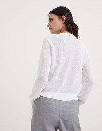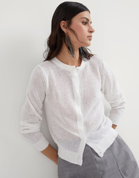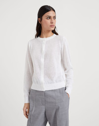 The noble fibers of Brunello Cucinelli knitwear and feminine elements come together in this new linen and silk cardigan. The refined Diamante yarn combines the natural beauty of linen and silk yarns with shiny paillettes, spreading sparkling reflections throughout the garment’s surface. The monili detail behind the neck completes the style of the sweater with an additional shimmering note. MATERIALS Manufacturing of the lightweight Diamond yarn combines the linen and silk natural fibers with tiny paillettes incorporated into the yarn that spread delicate sparkling reflections on the surface of the garment. DETAILS Snap closure Crew-neck Regular shoulder Regular sleeve Plain stitch Nickel-free monili decoration 75% LINEN, 25% SILK