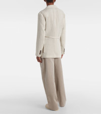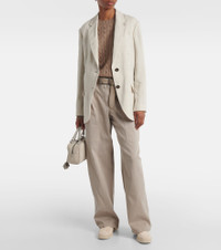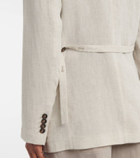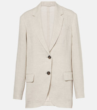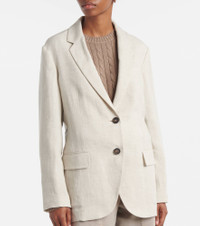 Product Details - Material: 97% linen, 2% polyester, 1% polyamide - Care instructions: dry clean - Made in Italy - Designer color name: Beige - Pocket lining: 74% acetate, 26% silk - Lining: 65% acetate, 35% polyester - Closure: single-breasted (two buttons) - Pockets: flap pockets - Item number: P01015991 Size & Fit - True to size - Shoulder pad inserts - Cinched waist - Non-stretchy fabric - Falls below the hip - The model seen in the picture is 178cm-5'10" and wearing a size IT 40