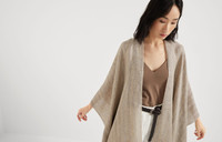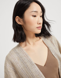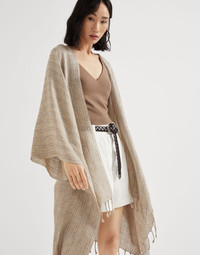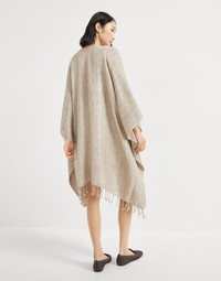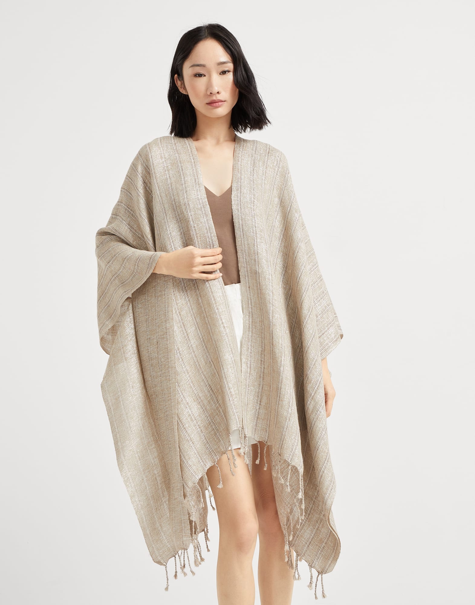 A refined aesthetic characterizes this linen Sparkling yarn poncho. The shimmering effect that radiates from the garment’s surface enriches the natural fiber’s slightly irregular texture, elegantly complementing the silhouette’s generous, unstructured volume. The fringe on the bottom completes the design with a dynamic, summery touch. MATERIALS The pure linen yarn offers a fine, slightly irregular thickness. The fabric is characterized by a light texture and a semi-crisp effect emphasized by the metallic reflections of the lame yarn. DETAILS Hem with fringe 53% LINEN, 33% POLYESTER, 8% METAL, 6% NYLON