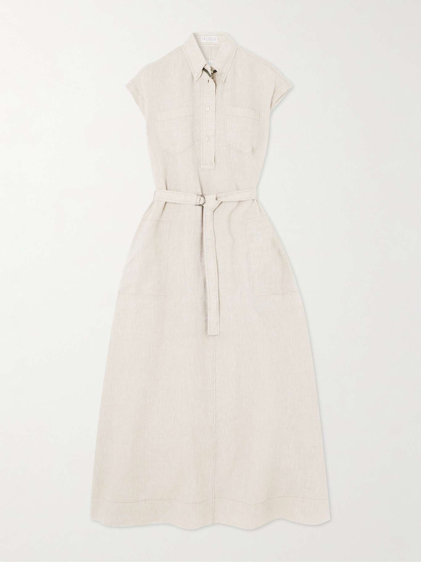 EDITORS'NOTES Brunello Cucinelli’s dress is the kind of easy style you put on and look instantly put together. Made from linen, it features the brand's signature Monili beads that peek out from under the buttoned pointed collar. The detachable waist belt cinches the breezy shape so nicely. Wear yours with sandals and neutral accessories. SIZE & FIT Model measurements: - Fits true to size, take your normal size - Cut for a loose fit, use the belt to cinch in at the waist - Mid-weight, non-stretchy fabric - Model is 180cm/ 5'11" and is wearing a size Small - Bust: 85cm/ 33.5" - Waist: 62cm/ 24.5" - Hip: 88cm/ 34.5" DETAILS & CARE - Beige linen - Button fastenings along front - 100% linen - Dry clean