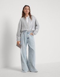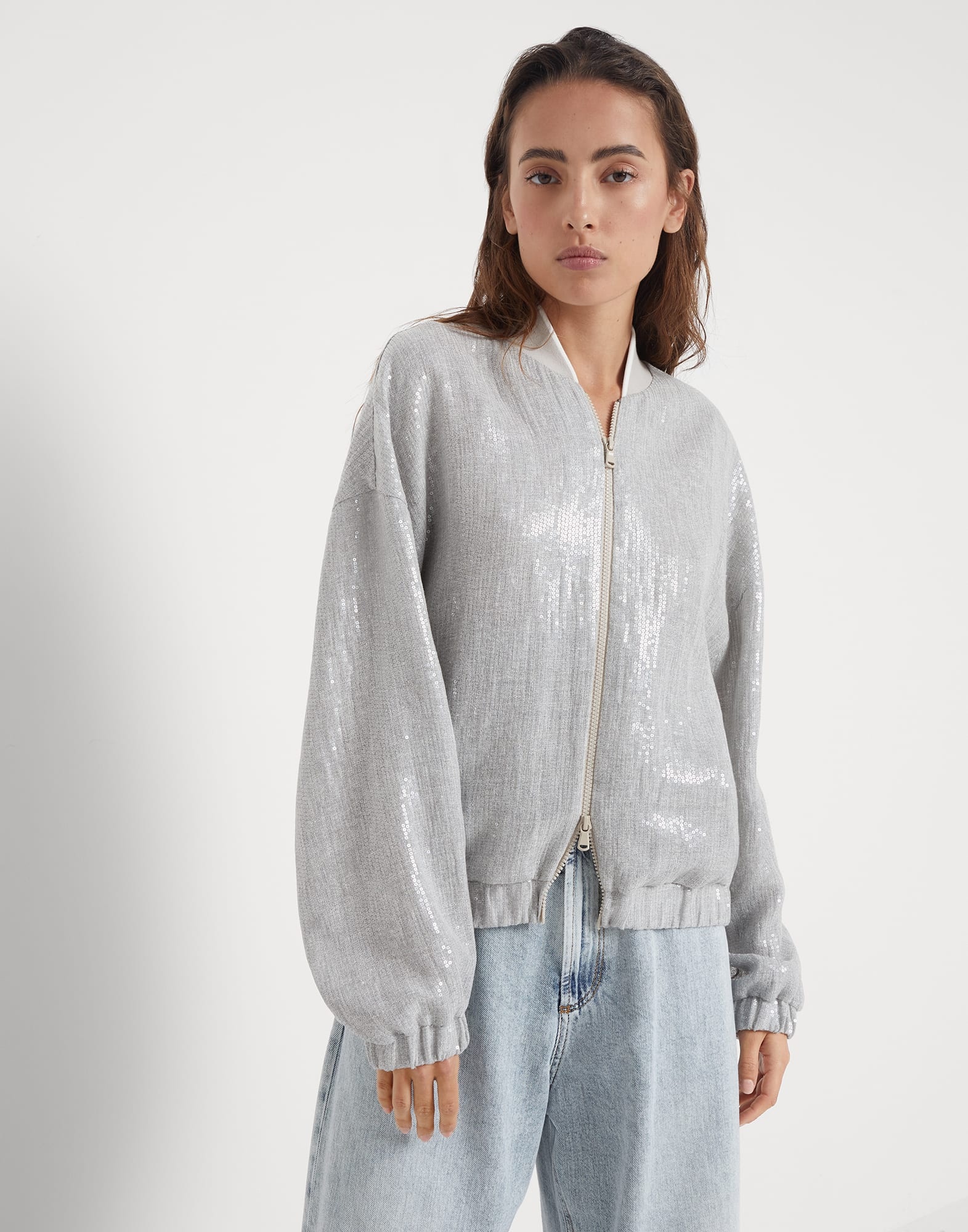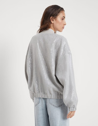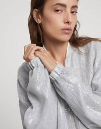 Feminine materials update the iconic style of sporty outerwear in this linen garza bomber jacket. Enriched with small paillettes, the fabric spreads sparkling notes with a wet effect throughout the garment’s surface. The characteristic zipper closure, rib knit collar and elasticized cuffs provide the jacket with added comfort. MATERIALS The linen garza showcases a light, rustic appearance. The special manufacturing of the fabric on traditional looms makes it possible to obtain a unique effect, characterized by a very wide weave and a textured appearance. DETAILS Crew-neck in rib knit Two-way zip closure Elasticized hem 90% LINEN, 10% NYLON