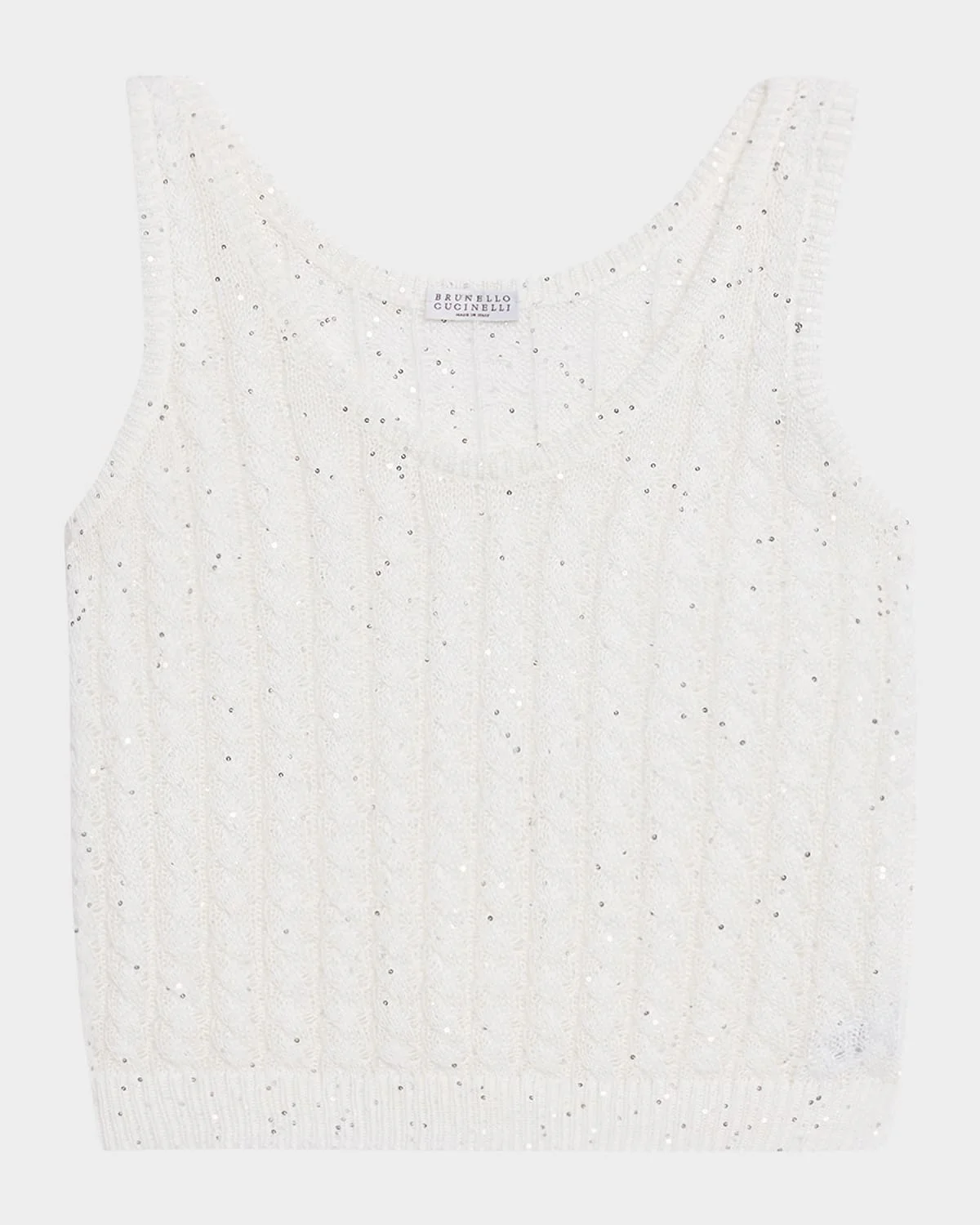 Embellished with sequins, this linenblend tank top by Brunello Cucinelli is finished with cableknit detailing Scoop neckline Sleeveless Classic fit Hip length Pullover style Linen/nylon/polyamide Made in Italy