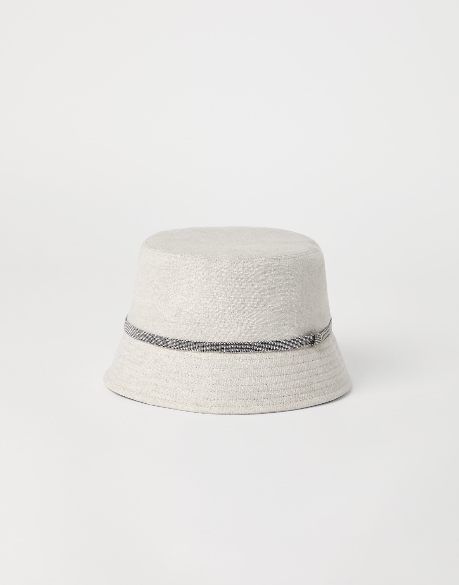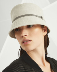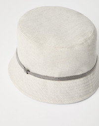 The iconic, sporty lines of this Bucket hat are paired with Brunello Cucinelli’s refined materials and signature details. The rustic, dry hand of linen canvas is enriched with a process that spreads a delicate, irregular lame effect on the accessory’s surface. The precious monili band completes the hat with a feminine, sparkling note. MATERIALS The pure linen fabric combines the classic rustic, irregular texture of canvas with a special finish that gives the surface a metallic effect in delicate shimmering tones. The lining perfects the accessory’s comfort. DETAILS Lined Nickel-free monili decoration 97% LINEN, 2% POLYESTER, 1% NYLON