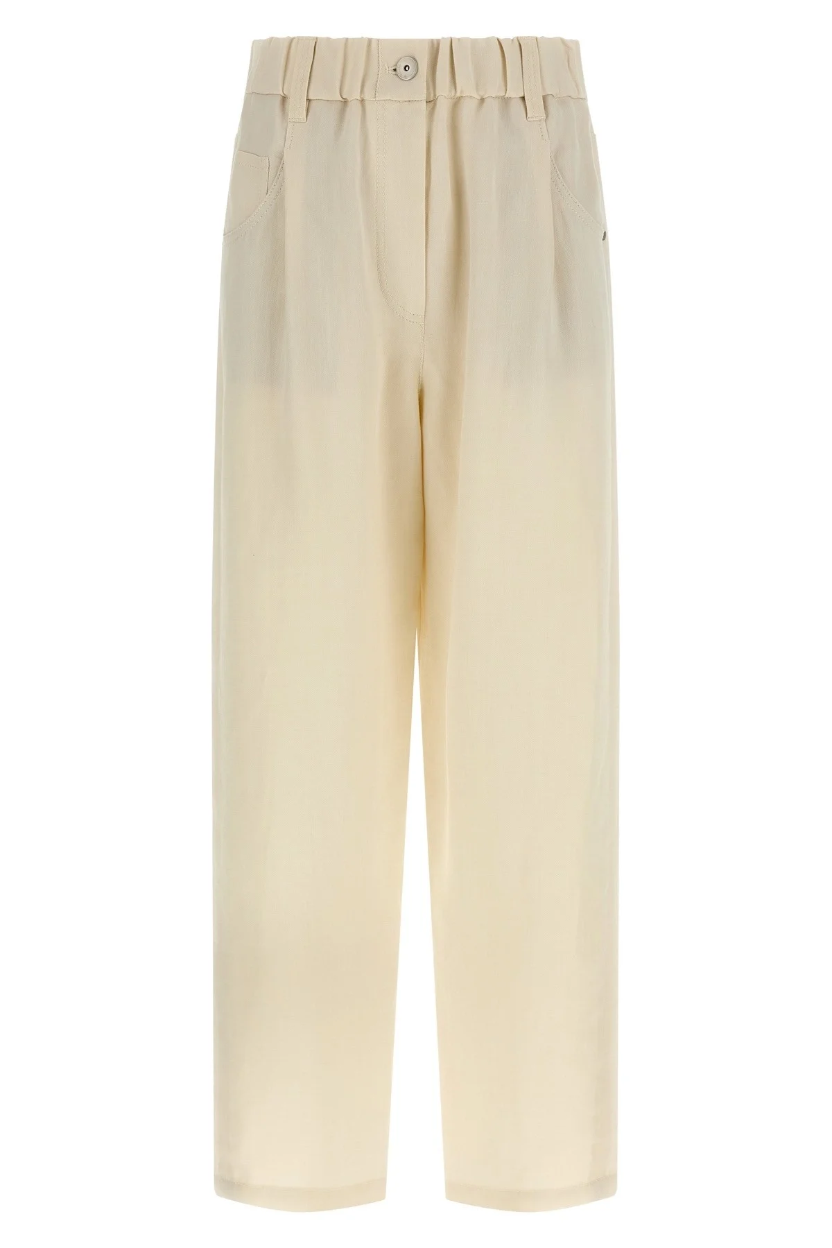 cod. MH126P9148C579 Five-pocket pants in linen blend with elastic waistband, belt with Monile detail loops, and front button. Color: White Size & Fit: True to size fit Composition: 72% viscose, 28% linen Made in: Italy