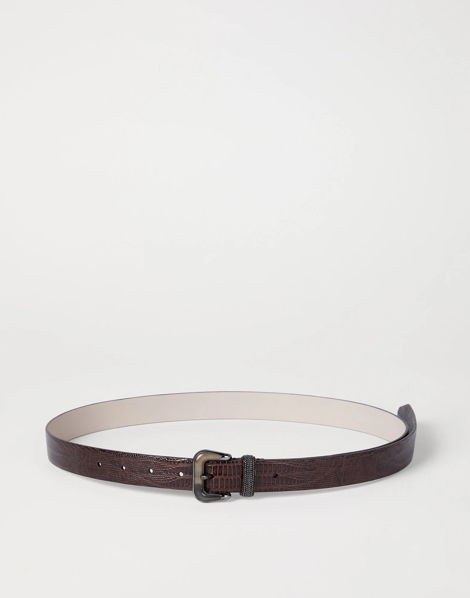 Refined elegance defines this lizard-effect calfskin belt. The special finish of the leather reproduces an exotic texture that echoes the beauty of nature. The precious monili loops complete the design with a sparkling note in true Brunello Cucinelli style. MATERIALS A "lizard-effect" finish enriches the clean look of the refined calfskin leather with a textured surface that evokes a sophisticated, exotic allure. DETAILS Leather lining Nickel-free monili decoration Belt height approx. 2.5 cm (0.98") REAL LEATHER