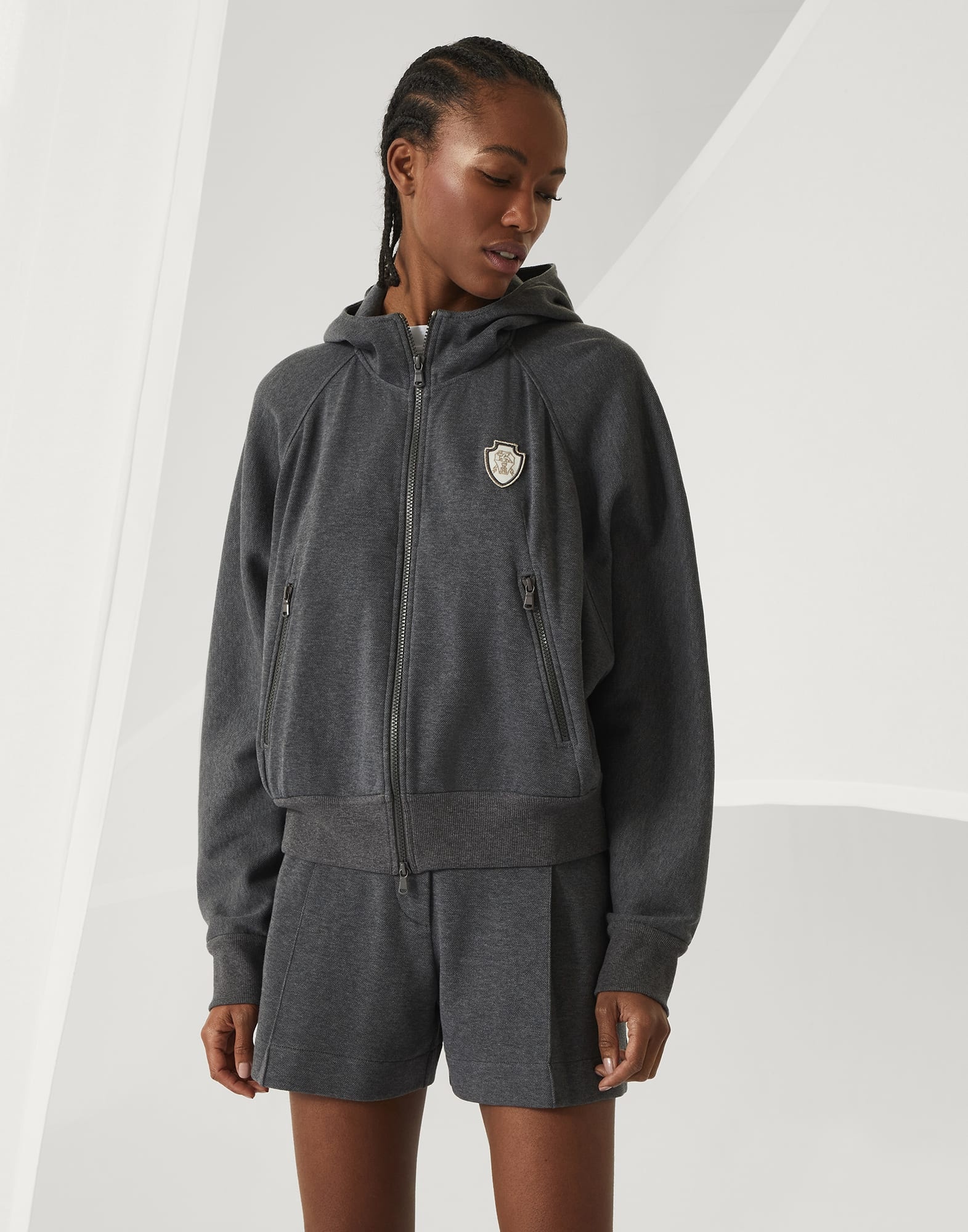 A sporty style meets iconic details in the new techno cotton pique sweatshirt. The hood and low pocket design express a distinctly casual feel, while the iconic Solomeo heraldic coat of arms on the chest complements the look of the garment. MATERIALS Research on the finest materials elevates the sporty feel of cotton pique, a menswear-inspired fabric. The presence of a synthetic fiber makes the fabric comfortable, lightweight and extremely pleasant to wear. DETAILS Two-way zip closure Hood Hand pockets with zipper 93% COTTON, 7% NYLON