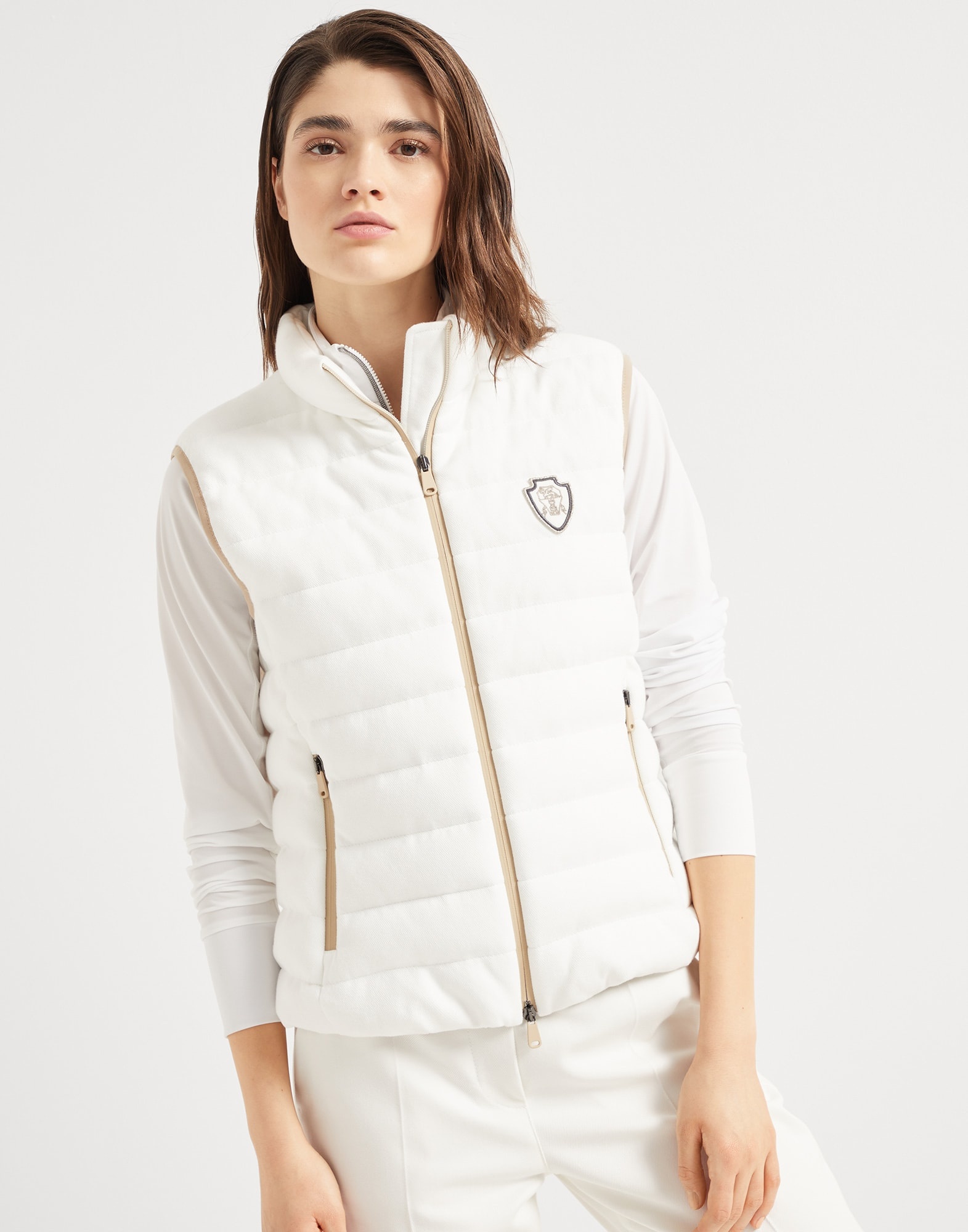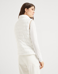 Lightness, protection and iconic details define the style of this techno cotton pique down vest. The soft, premium-quality padding and practical drawstring bottom provide comfort. The iconic Solomeo heraldic coat of arms on the chest complements the look of the garment. MATERIALS Research on the finest materials elevates the sporty feel of cotton pique, a menswear-inspired fabric. The presence of a synthetic fiber makes the fabric comfortable, lightweight and extremely pleasant to wear. DETAILS Two-way zip closure Water-resistant nylon lining Hand pockets with zipper Drawstring hem 93% COTTON, 7% NYLON