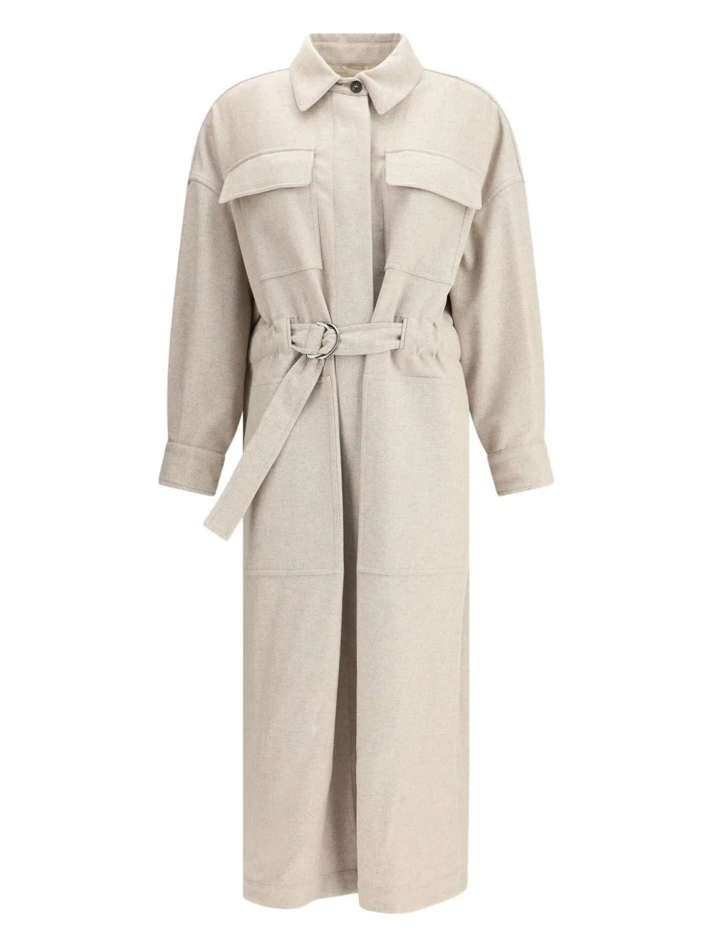 belted flap-pocket coat Highlights - Beige - Button-front fastening - Flap-patch pockets - Self-tie belt - D-ring belt detail - Long sleeves Made In Italy Composition Wool 98%, Other Fabrics 2% Washing instructions Read Manufacturer Guidelines