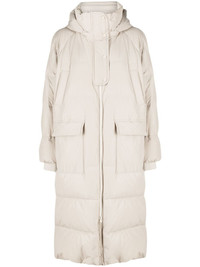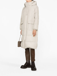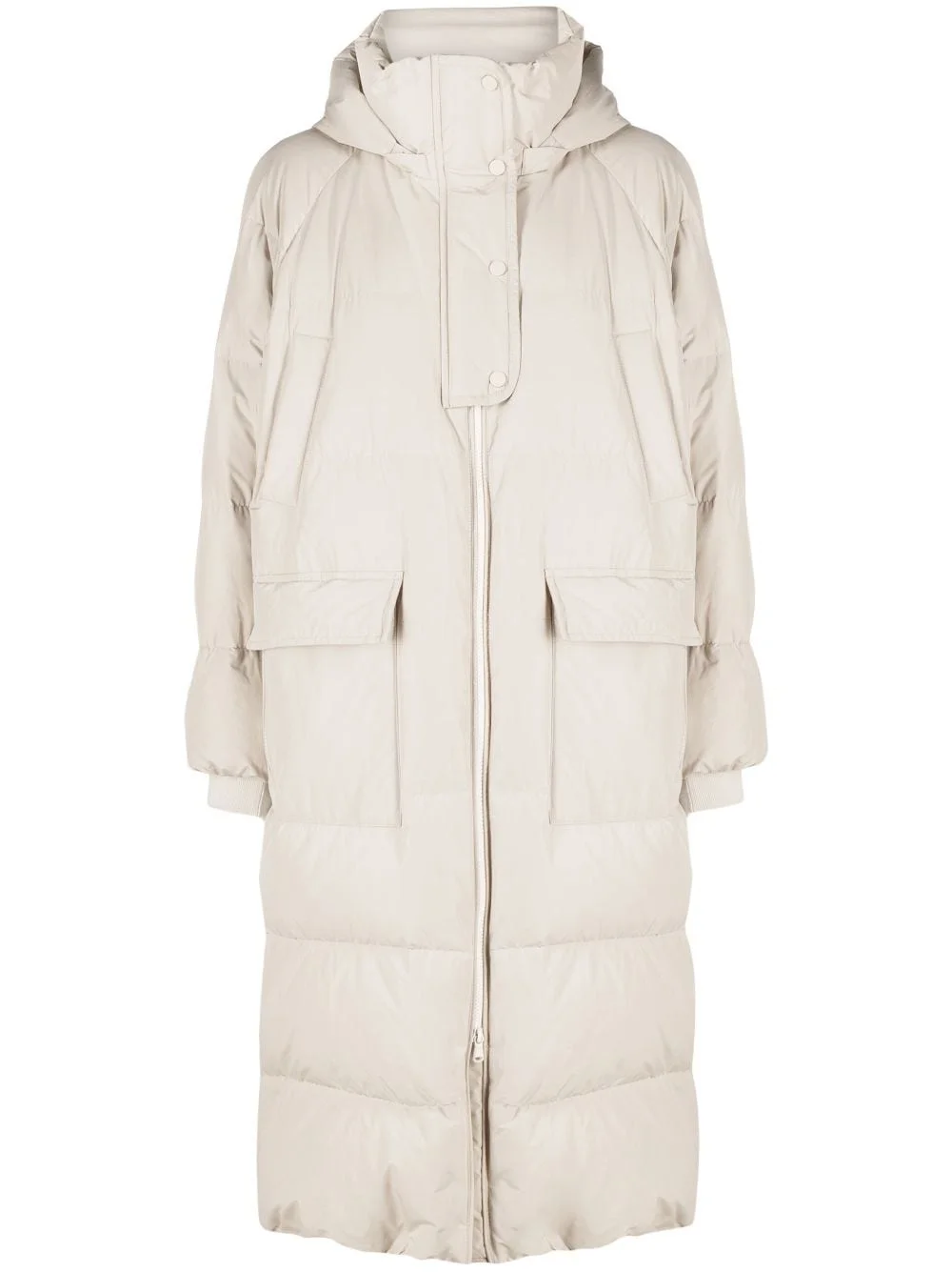 long puffer coat Highlights - Light beige - Feather down - Padded design - Classic hood - Press-stud fastening collar - Long sleeves - Front zip fastening - Two side flap pockets - Elasticated cuffs - Short side slits - Straight hem - Calf-length Made in Italy Composition Outer: Polyester 55%, Cotton 45% Lining: Polyamide 100%, Polyester 100%, Feather Down 100%, Nylon 100% Washing instructions Dry Clean Only