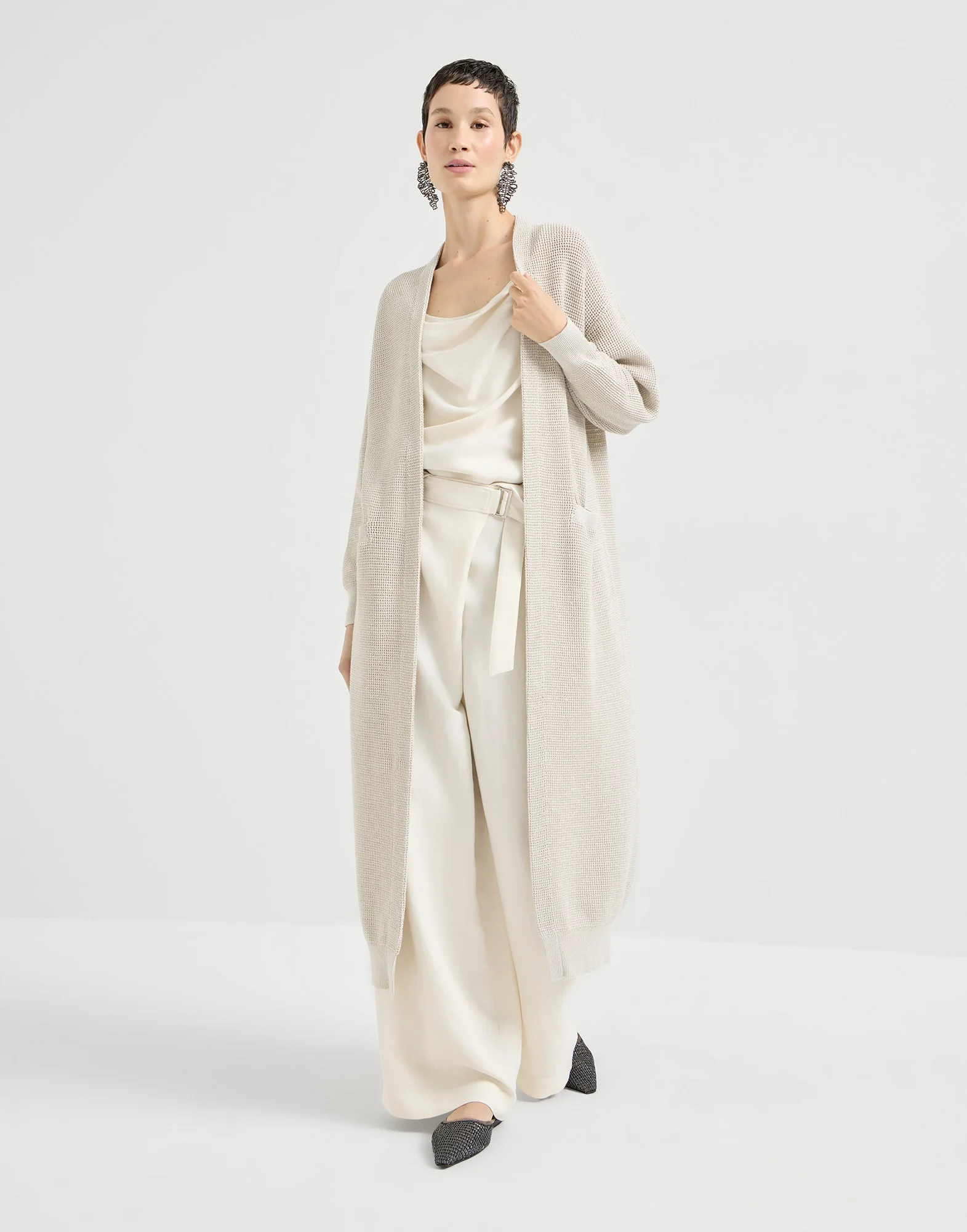 Shimmering details enhance the essential lines of this cotton sparkling net long cardigan. The surface of the soft yarn features delicate lame reflections, giving the garment a sophisticated, feminine elegance. The design’s comfortable proportions with slightly dropped shoulders and wide sleeves define the relaxed silhouette. MATERIALS The cotton yarn is soft, lightweight and breathable, making it ideal for summer and spring garments. The lame thread enriches the surface with delicate reflections. DETAILS Rib knit cuffs and bottom band Horizontal hand pockets 79% COTTON, 16% VISCOSE, 5% POLYESTER