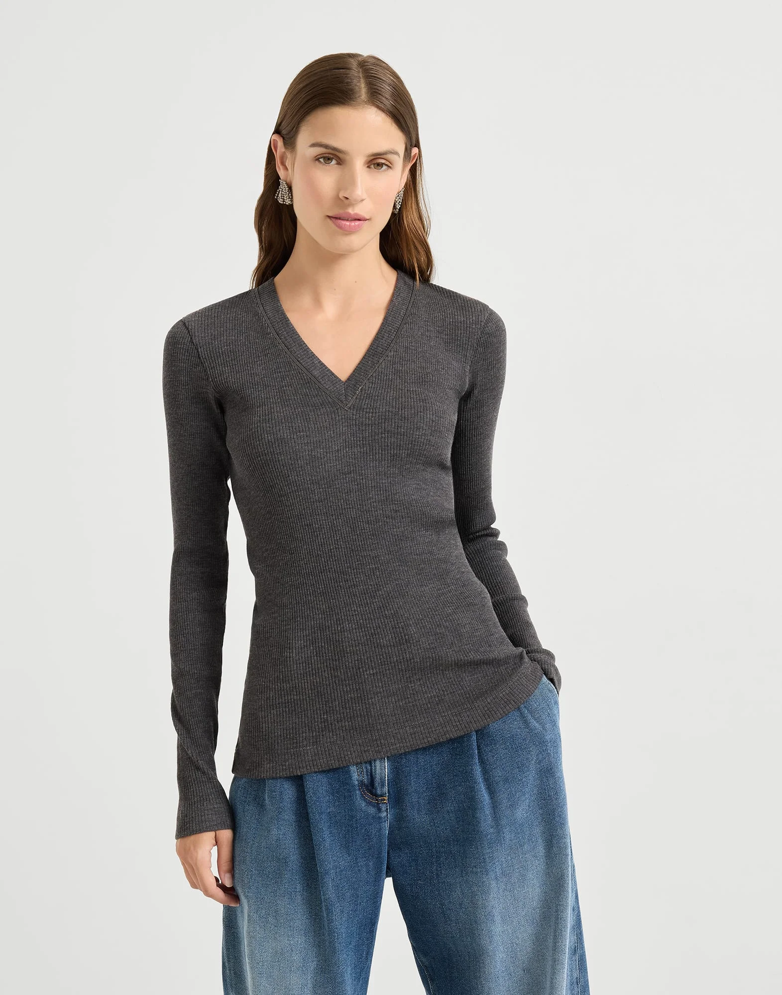 The iconic embellishment of the Brunello Cucinelli collections enriches the minimalist style of this long-sleeve ribbed wool jersey T-shirt. The V-neck is illuminated with a precious trail of fine rows of shiny monili, adding a sparkling touch to the garment. The compact texture and slightly fitted lines make the fit very comfortable. MATERIALS Wool jersey is a warn, lightweight fabric, enriched with a small percentage of synthetic fiber to provide added comfort. DETAILS V-neck Regular shoulder Regular sleeve Rib knit Nickel-free monili decoration 100% WOOL