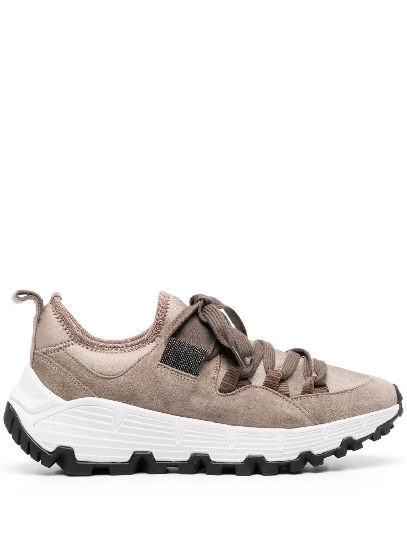 low-top lace-up sneakers low-top lace-up sneakers from BRUNELLO CUCINELLI featuring brown, calf leather, round toe, front lace-up fastening, pull-tab at the heel and flat rubber sole. Made in Italy Composition Lining: Calf Leather 100%, Fabric 100% Outer: Calf Leather 100%, Fabric 100% Sole: Rubber 100% SIZE & FIT Measurement HEEL 1.8 in(4.5 cm) Sole height 0.8 in(2 cm)