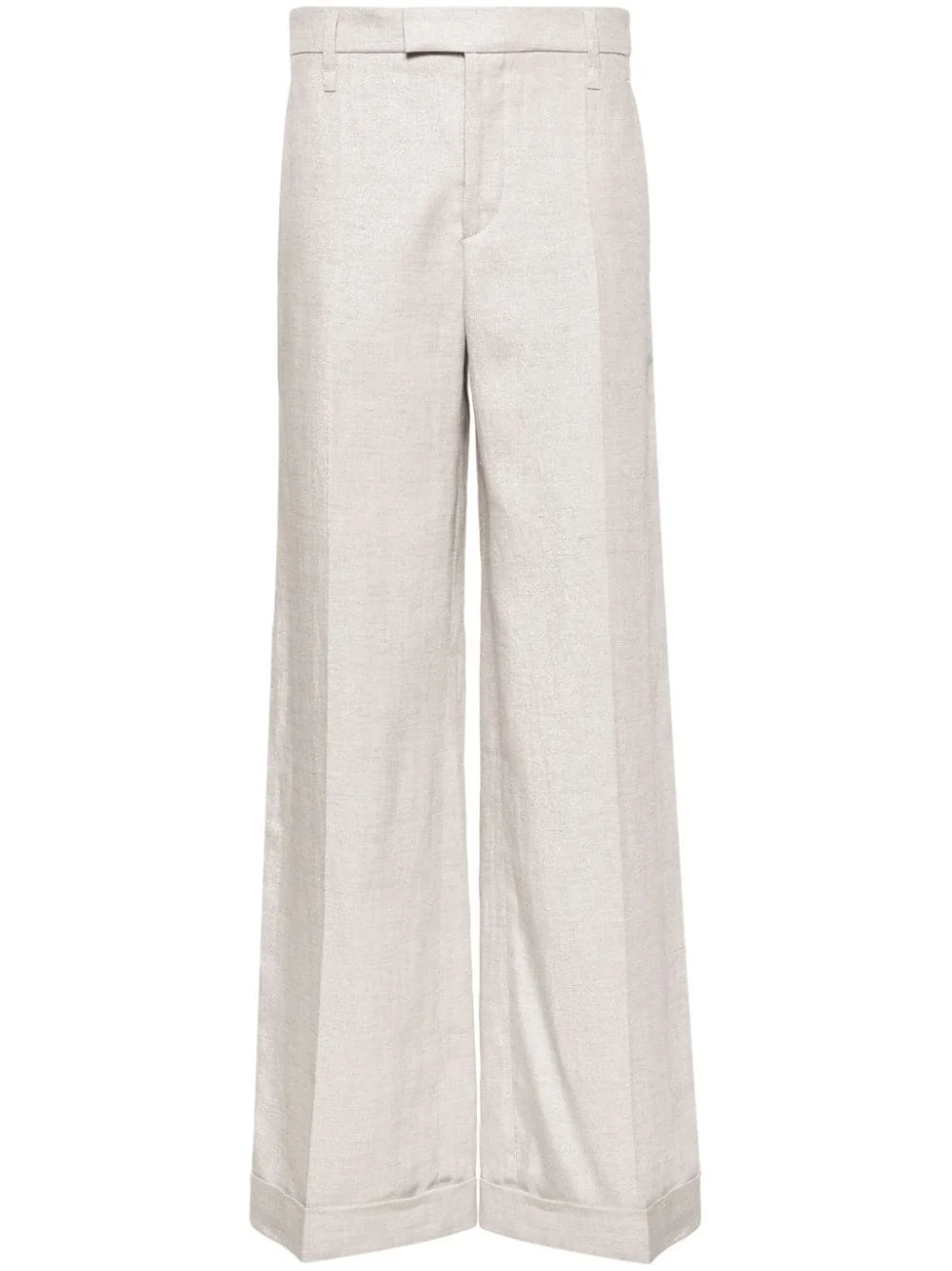 lurex wide-leg trousers Highlights - Nickel grey - Linen-cotton blend - Lurex detailing - High-waisted - Pressed crease - Belt loops - Concealed front button, hook and zip fastening - Two side slash pockets - Two rear welt pockets - Wide leg - Turn-up hem Made in Italy Composition Lining: Cotton 100%, Polyester 36%, Acetate 32%, Cupro 32% Outer: Linen/Flax 95%, Polyester 3%, Polyamide 2% SIZE & FIT Model measurements Height 5 ft 10 in(1.78 m) Bust/Chest 33.07 in(84 cm) Hips 36.61 in(93 cm) Waist 24.8 in(63 cm) FittingInformation Designed with a wide-leg cut, these trousers allow for a close fit at the waist and offer a loose and roomy fit over the leg Made from a midweight non-stretch fabric This piece fits true to size – take your usual size Washing instructions Dry Clean Only