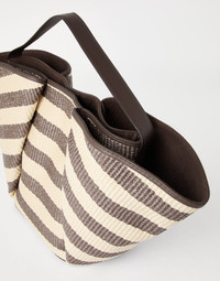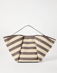 The summery allure of striped techno cotton raffia enriches the essential silhouette of this Marina shopper bag. The woven raffia texture gives the accessory a slightly “rustic”, natural appearance, while the handle is detailed in soft leather, for a refined material contrast. Structured yet flexible, the bag showcases a thick striped pattern, perfect for adding a casual elegance to everyday occasions. MATERIALS The techno cotton raffia is characterized by the combination of cotton with a synthetic thread. The leather details complete the style with a sophisticated touch. DETAILS Magnetic snap closure Handle Internal pocket with zip closure 2 open internal compartments Fabric lining Bag is 53 cm (20.87") long, 17 cm (6.69") wide, and 33 cm (12.99") high 61% COTTON, 39% NYLON