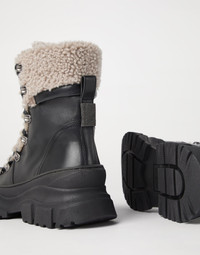 The Mountain feel of these new matte calfskin boots is enriched with precious details in true Brunello Cucinelli style. Smooth and compact, the leather is paired with soft shearling accents to create an alluring material contrast that defines the footwear’s wintry look. The rubber lug outsole provides a bold touch, while accentuating the comfortable fit. The shiny monili embroidery on the back tab completes the boots with an iconic feminine note. MATERIALS Matte calfskin features a smooth, even texture. The leather’s matte appearance brings out the season’s colors with an intense, rich effect. A soft leather lining is paired with a thin leather outsole with a rubber tread, making the fit comfortable. DETAILS Cashmere laces Leather lining Shearling insert Rubber outsole Nickel-free monili decoration The heel height measures 6 cm (2.36") 100% REAL LEATHER