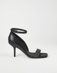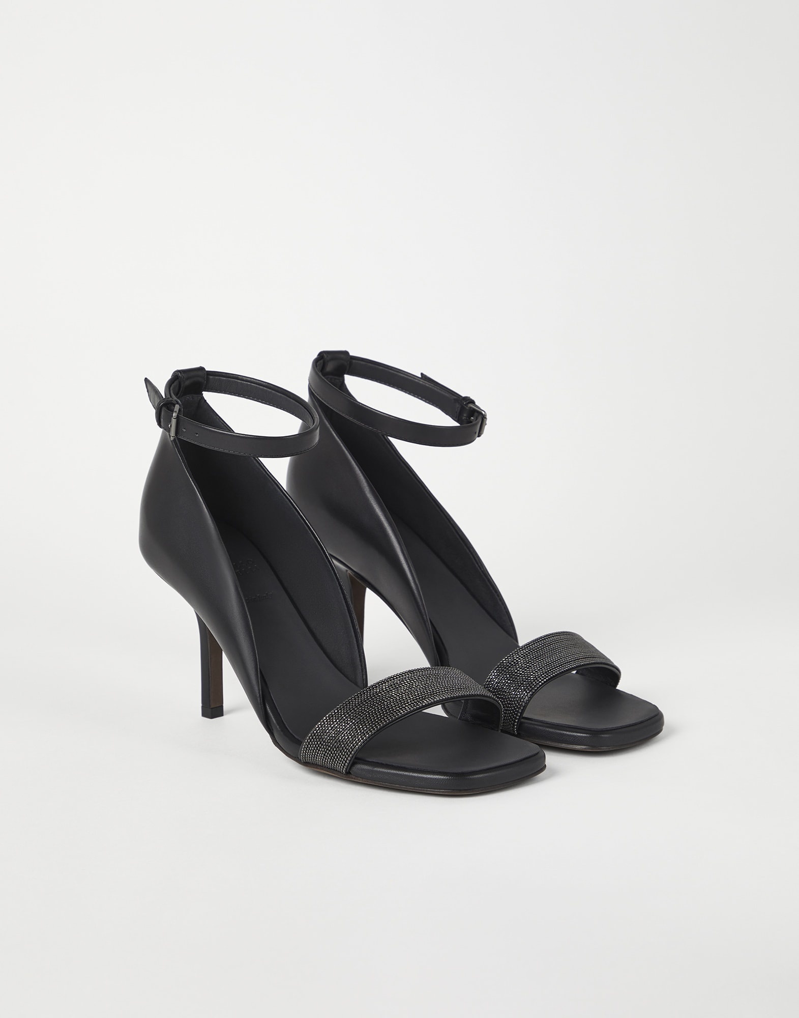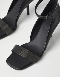 Precious embellishments and feminine lines define the sophisticated feel of these new heels. The refined texture of luxurious matte calfskin complements the footwear’s shapely design, while the strap embroidered with fine rows of monili adds a sparkling touch. The adjustable ankle strap and the stiletto heel complete the style. MATERIALS Matte calfskin, a material with a smooth, even appearance, is paired with Brunello Cucinelli’s iconic embellishment that covers the front strap. The leather bottom with TPU rubber inserts provides added comfort. DETAILS Adjustable strap closure Leather lining Leather sole Non-slip TPU rubber at heel and toe Nickel-free monili decoration 8 cm heel REAL LEATHER